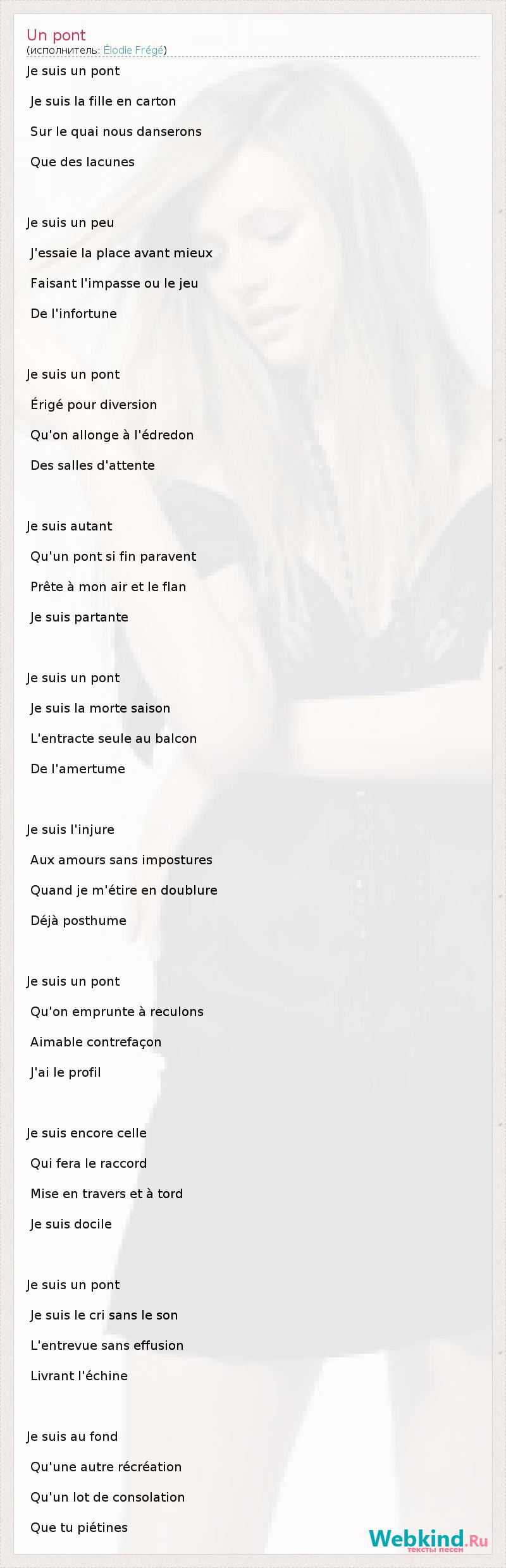 Je suis un pont Je suis la fille en carton Sur le quai nous danserons Que des lacunes Je suis un peu J'essaie la place avant mieux Faisant l'impasse ou le jeu De l'infortune Je suis un pont Érigé pour diversion Qu'on allonge à l'édredon Des salles d'attente Je suis autant Qu'un pont si fin paravent Prête à mon air et le flan Je suis partante Je suis un pont Je suis la morte saison L'entracte seule au balcon De l'amertume Je suis l'injure Aux amours sans impostures Quand je m'étire en doublure Déjà posthume Je suis un pont Qu'on emprunte à reculons Aimable contrefaçon J'ai le profil Je suis encore celle Qui fera le raccord Mise en travers et à tord Je suis docile Je suis un pont Je suis le cri sans le son L'entrevue sans effusion Livrant l'échine Je suis au fond Qu'une autre récréation Qu'un lot de consolation Que tu piétines