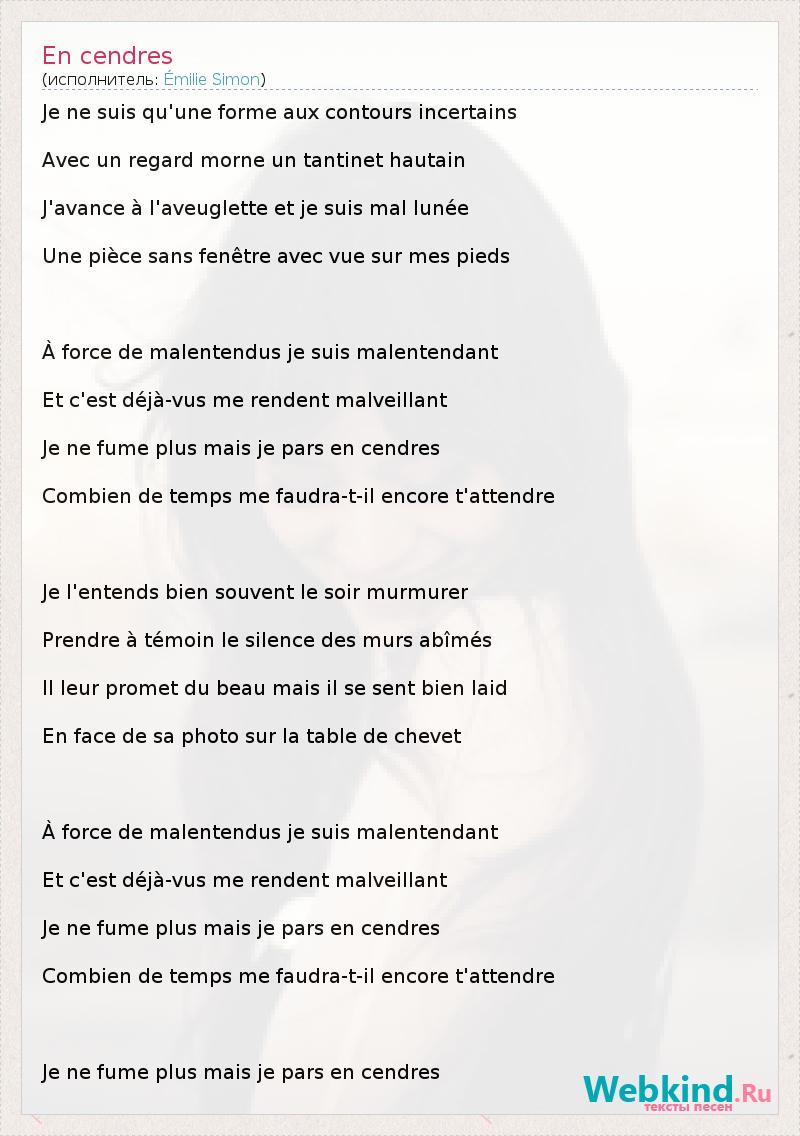 Je ne suis qu'une forme aux contours incertains Avec un regard morne un tantinet hautain J'avance à l'aveuglette et je suis mal lunée Une pièce sans fenêtre avec vue sur mes pieds À force de malentendus je suis malentendant Et c'est déjà-vus me rendent malveillant Je ne fume plus mais je pars en cendres Combien de temps me faudra-t-il encore t'attendre Je l'entends bien souvent le soir murmurer Prendre à témoin le silence des murs abîmés Il leur promet du beau mais il se sent bien laid En face de sa photo sur la table de chevet À force de malentendus je suis malentendant Et c'est déjà-vus me rendent malveillant Je ne fume plus mais je pars en cendres Combien de temps me faudra-t-il encore t'attendre Je ne fume plus mais je pars en cendres