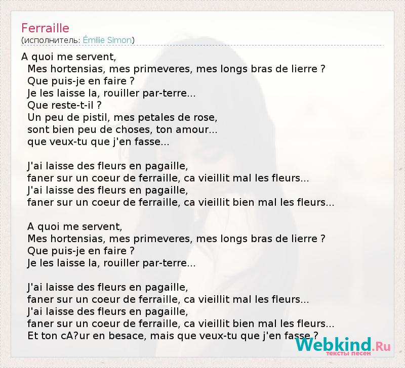 A quoi me servent, Mes hortensias, mes primeveres, mes longs bras de lierre ? Que puis-je en faire ? Je les laisse la, rouiller par-terre... Que reste-t-il ? Un peu de pistil, mes petales de rose, sont bien peu de choses, ton amour... que veux-tu que j'en fasse... J'ai laisse des fleurs en pagaille, faner sur un coeur de ferraille, ca vieillit mal les fleurs... J'ai laisse des fleurs en pagaille, faner sur un coeur de ferraille, ca vieillit bien mal les fleurs... A quoi me servent, Mes hortensias, mes primeveres, mes longs bras de lierre ? Que puis-je en faire ? Je les laisse la, rouiller par-terre... J'ai laisse des fleurs en pagaille, faner sur un coeur de ferraille, ca vieillit mal les fleurs... J'ai laisse des fleurs en pagaille, faner sur un coeur de ferraille, ca vieillit bien mal les fleurs... Et ton cA?ur en besace, mais que veux-tu que j'en fasse ?