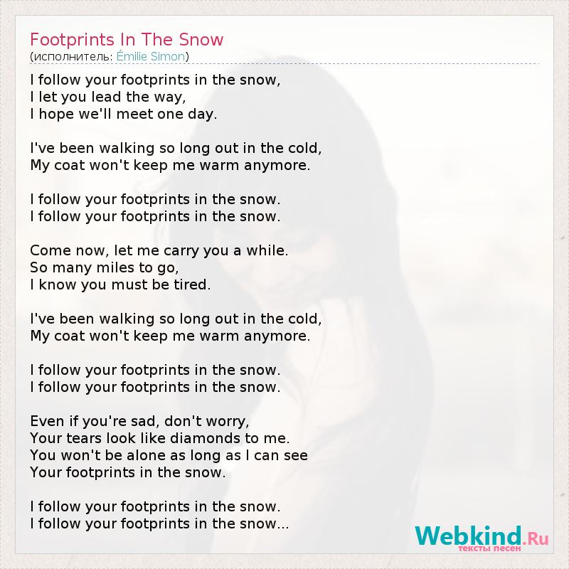Я иду по твоим следам на снегу, Я позволю тебе продолжить путь, Я надеюсь, однажды мы встретимся. Я так долго гуляла по холоду, Что моё пальто больше не греет меня. Я иду по твоим следам на снегу. Я иду по твоим следам на снегу. Ну-ка, позволь мне теперь повести, на время. Так много миль прошли, Я знаю, ты устал. Я так долго гуляла по холоду, Что моё пальто больше не греет меня. Я иду по твоим следам на снегу. Я иду по твоим следам на снегу. Даже если ты загрустишь, не бойся, Твои слёзы заблестят как алмазы, для меня. Ты не будешь одинок, до тех пор, пока я вижу Твои следы на снегу... Я иду по твоим следам на снегу. Я иду по твоим следам на снегу...