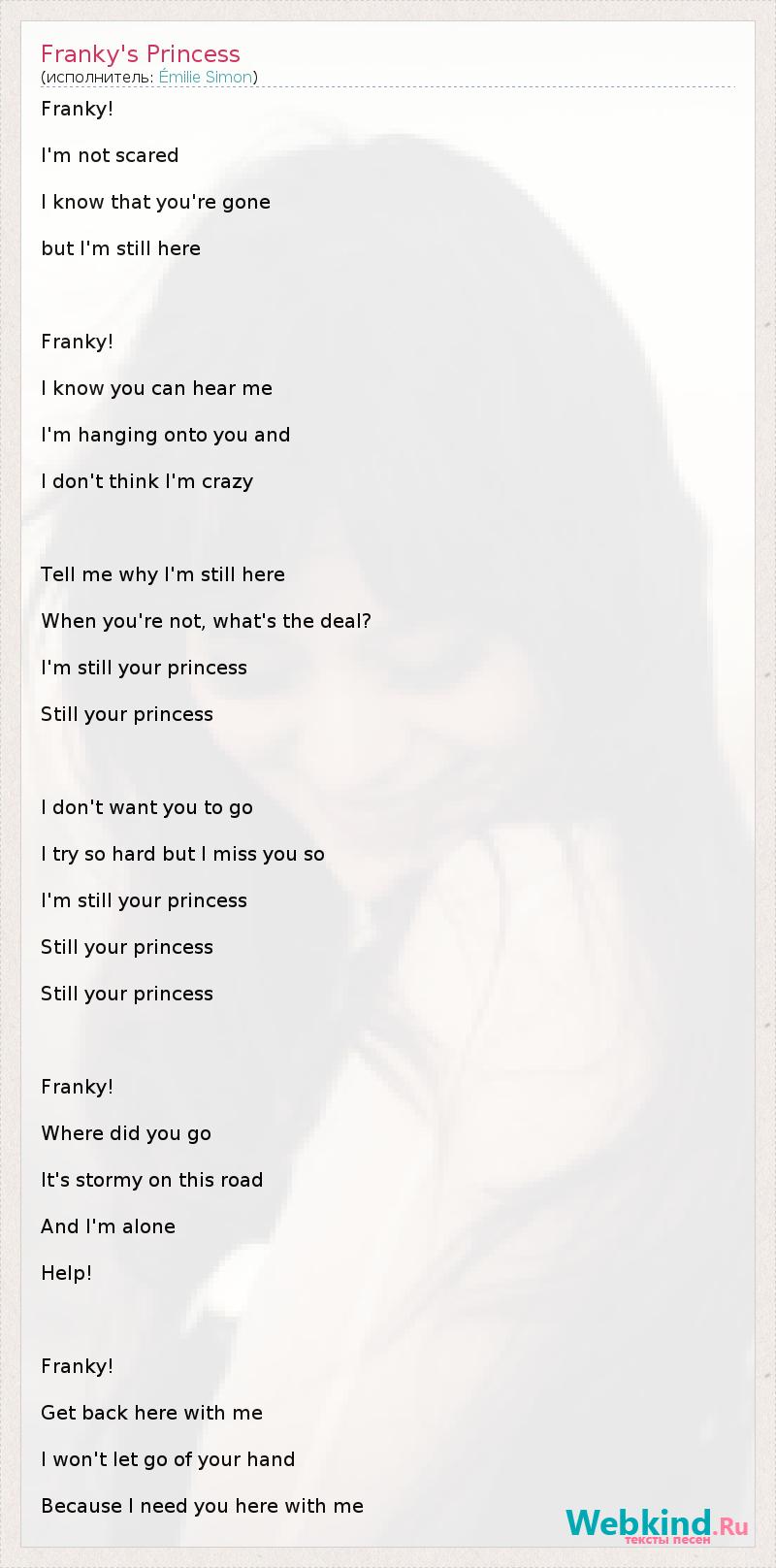 Franky! I'm not scared I know that you're gone but I'm still here Franky! I know you can hear me I'm hanging onto you and I don't think I'm crazy Tell me why I'm still here When you're not, what's the deal? I'm still your princess Still your princess I don't want you to go I try so hard but I miss you so I'm still your princess Still your princess Still your princess Franky! Where did you go It's stormy on this road And I'm alone Help! Franky! Get back here with me I won't let go of your hand Because I need you here with me