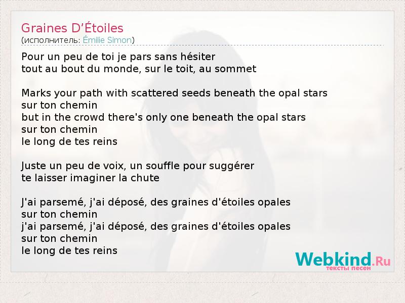 Pour un peu de toi je pars sans hésiter tout au bout du monde, sur le toit, au sommet Marks your path with scattered seeds beneath the opal stars sur ton chemin but in the crowd there's only one beneath the opal stars sur ton chemin le long de tes reins Juste un peu de voix, un souffle pour suggérer te laisser imaginer la chute J'ai parsemé, j'ai déposé, des graines d'étoiles opales sur ton chemin j'ai parsemé, j'ai déposé, des graines d'étoiles opales sur ton chemin le long de tes reins
