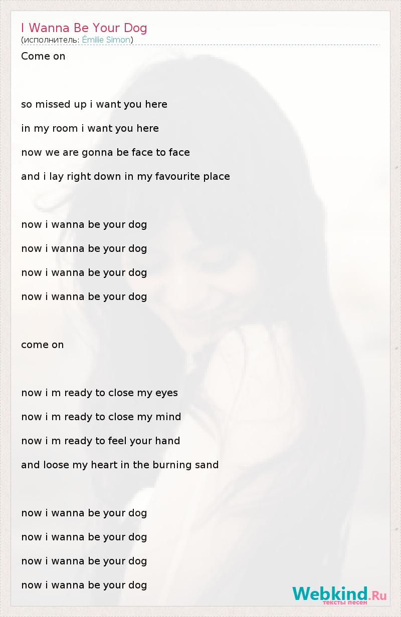 Come on so missed up i want you here in my room i want you here now we are gonna be face to face and i lay right down in my favourite place now i wanna be your dog now i wanna be your dog now i wanna be your dog now i wanna be your dog come on now i m ready to close my eyes now i m ready to close my mind now i m ready to feel your hand and loose my heart in the burning sand now i wanna be your dog now i wanna be your dog now i wanna be your dog now i wanna be your dog