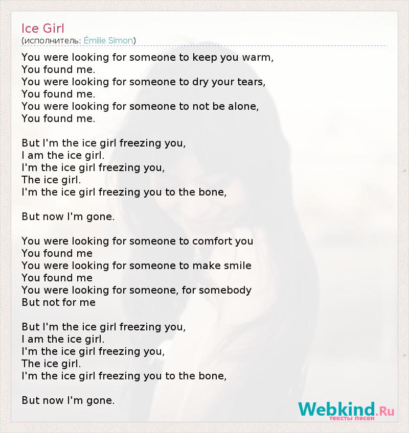 You were looking for someone to keep you warm, You found me. You were looking for someone to dry your tears, You found me. You were looking for someone to not be alone, You found me. But I'm the ice girl freezing you, I am the ice girl. I'm the ice girl freezing you, The ice girl. I'm the ice girl freezing you to the bone, But now I'm gone. You were looking for someone to comfort you You found me You were looking for someone to make smile You found me You were looking for someone, for somebody But not for me But I'm the ice girl freezing you, I am the ice girl. I'm the ice girl freezing you, The ice girl. I'm the ice girl freezing you to the bone, But now I'm gone.