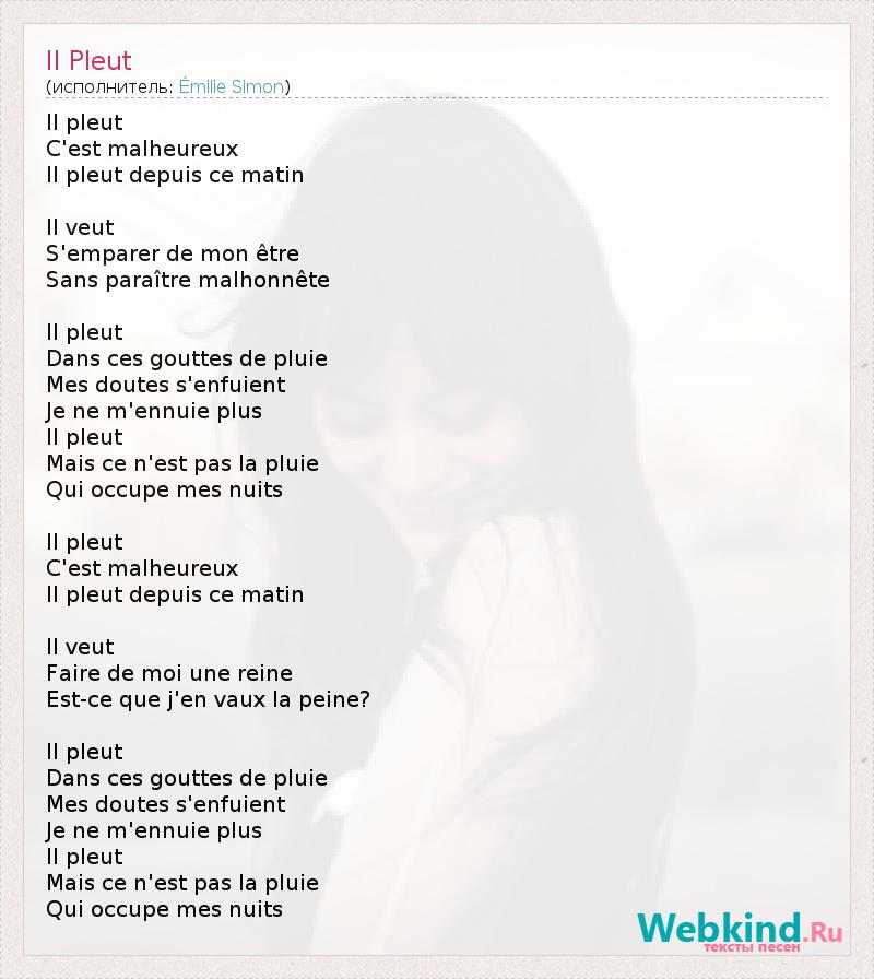 Il pleut C'est Малёрэ Il pleut Depuis се Matin Il veut S'emparer де пн être Без paraître malhonnête Il pleut Dans CES ГУТТ де Pluie Mes doutes s'enfuient Je пе m'ennuie плюс Il pleut Mais се n'est па- ла Pluie Квай occupe мес Nuits Il pleut C'est Малёрэ Il pleut Depuis се Matin Il veut Faire де Moi Une Reine Est- се дие J'en Вокс ла Пайне ? Il pleut Dans CES ГУТТ де Pluie Mes doutes s'enfuient Je пе m'ennuie плюс Il pleut Mais се n'est па- ла Pluie Квай occupe мес Nuits