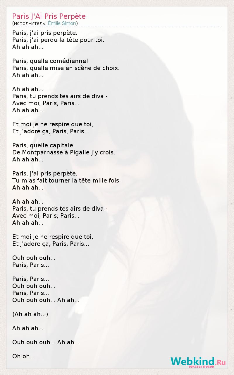 Париж, я покорена навечно. Париж, земля уходит из под ног из-за тебя. Ай-яй-яй... Париж, что за артист! Париж, что за мизансцена выбора. Ай-яй-яй. Ай-яй-яй... Париж, ты завладел поющей дивой - Мной. Париж, Париж... Ай-яй-яй... И я дышу только тобой, И я люблю тебя, Париж, Париж... Париж, столица. От Монпарнаса до Пигаль, я считаю. Ай-яй-яй... Париж, я покорена навечно. Ты заставил меня одуматься тысячу раз. Ай-яй-яй... Ай-яй-яй... Париж, ты завладел поющей дивой - Мной. Париж, Париж... Ай-яй-яй... И я дышу только тобой, И я люблю тебя, Париж, Париж... У-у-у... Париж, Париж... Париж, Париж... У-у-у... Париж, Париж... У-у-у... А-а... (Ай-яй-яй...) Ай-яй-яй... У-у-у... А-а... О-о...