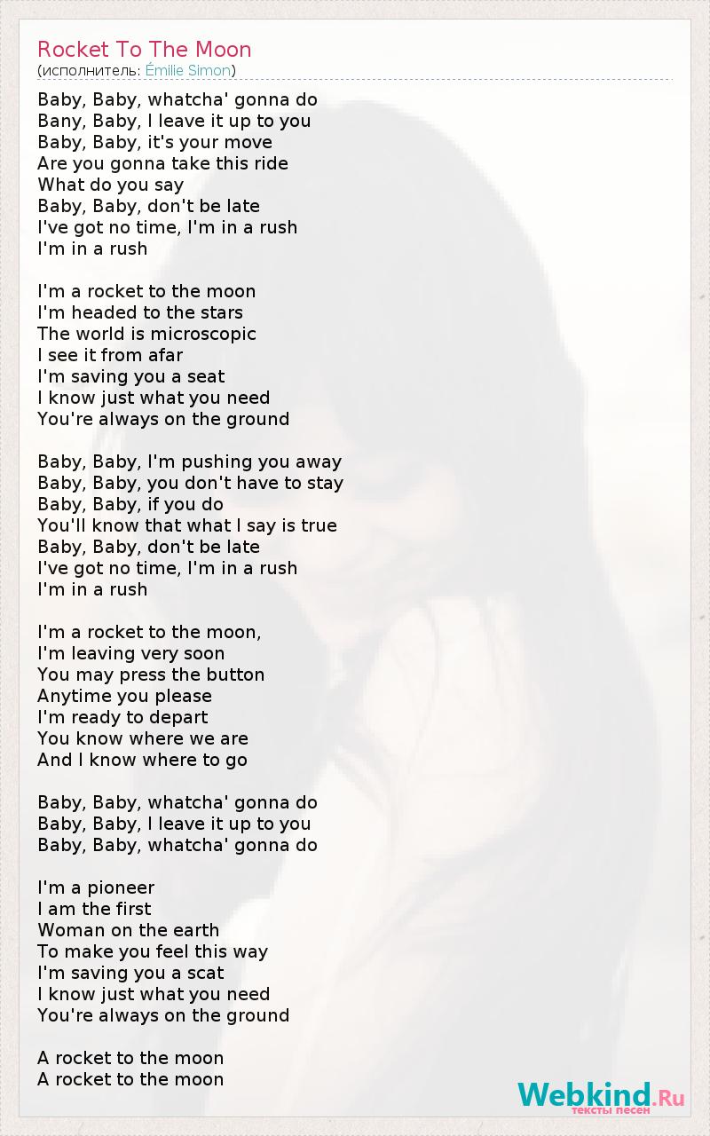 Baby, Baby, whatcha' gonna do Bany, Baby, I leave it up to you Baby, Baby, it's your move Are you gonna take this ride What do you say Baby, Baby, don't be late I've got no time, I'm in a rush I'm in a rush I'm a rocket to the moon I'm headed to the stars The world is microscopic I see it from afar I'm saving you a seat I know just what you need You're always on the ground Baby, Baby, I'm pushing you away Baby, Baby, you don't have to stay Baby, Baby, if you do You'll know that what I say is true Baby, Baby, don't be late I've got no time, I'm in a rush I'm in a rush I'm a rocket to the moon, I'm leaving very soon You may press the button Anytime you please I'm ready to depart You know where we are And I know where to go Baby, Baby, whatcha' gonna do Baby, Baby, I leave it up to you Baby, Baby, whatcha' gonna do I'm a pioneer I am the first Woman on the earth To make you feel this way I'm saving you a scat I know just what you need You're always on the ground A rocket to the moon A rocket to the moon