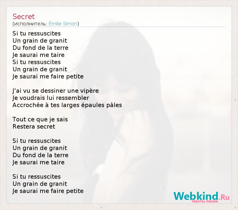 Si tu ressuscites Un grain de granit Du fond de la terre Je saurai me taire Si tu ressuscites Un grain de granit Je saurai me faire petite J'ai vu se dessiner une vipère Je voudrais lui ressembler Accrochée à tes larges épaules pâles Tout ce que je sais Restera secret Si tu ressuscites Un grain de granit Du fond de la terre Je saurai me taire Si tu ressuscites Un grain de granit Je saurai me faire petite