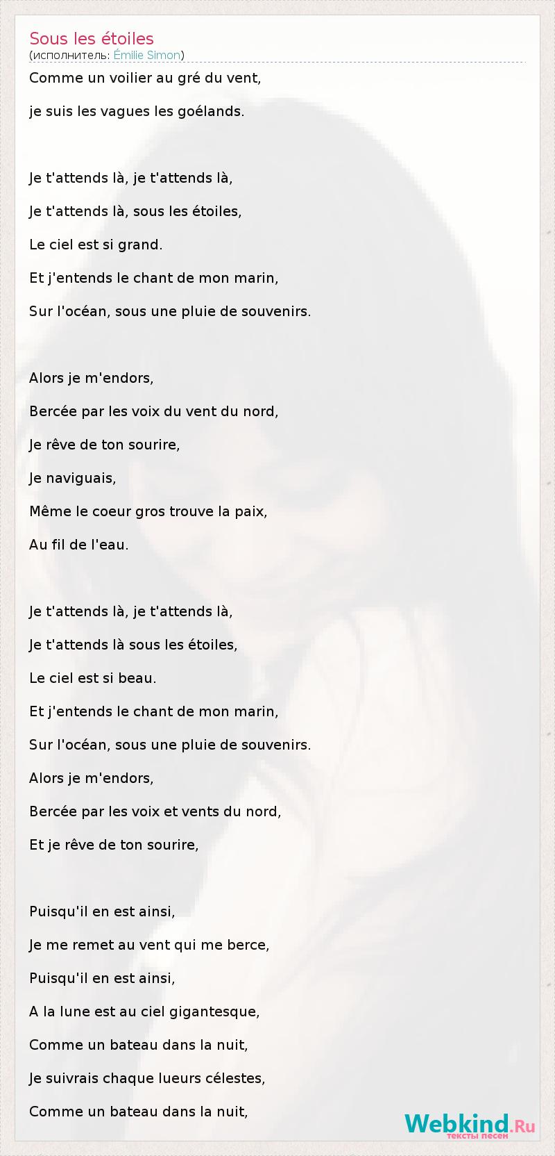 Comme un voilier au gré du vent, je suis les vagues les goélands. Je t'attends là, je t'attends là, Je t'attends là, sous les étoiles, Le ciel est si grand. Et j'entends le chant de mon marin, Sur l'océan, sous une pluie de souvenirs. Alors je m'endors, Bercée par les voix du vent du nord, Je rêve de ton sourire, Je naviguais, Même le coeur gros trouve la paix, Au fil de l'eau. Je t'attends là, je t'attends là, Je t'attends là sous les étoiles, Le ciel est si beau. Et j'entends le chant de mon marin, Sur l'océan, sous une pluie de souvenirs. Alors je m'endors, Bercée par les voix et vents du nord, Et je rêve de ton sourire, Puisqu'il en est ainsi, Je me remet au vent qui me berce, Puisqu'il en est ainsi, A la lune est au ciel gigantesque, Comme un bateau dans la nuit, Je suivrais chaque lueurs célestes, Comme un bateau dans la nuit,