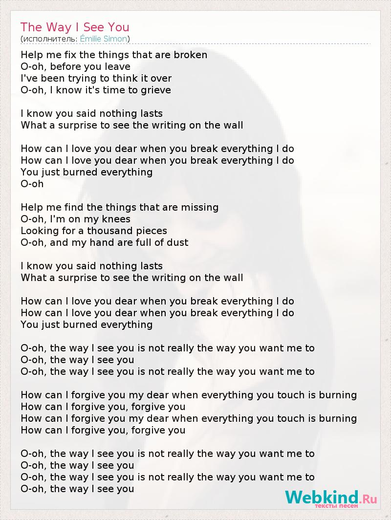 Help me fix the things that are broken O-oh, before you leave I've been trying to think it over O-oh, I know it's time to grieve I know you said nothing lasts What a surprise to see the writing on the wall How can I love you dear when you break everything I do How can I love you dear when you break everything I do You just burned everything O-oh Help me find the things that are missing O-oh, I'm on my knees Looking for a thousand pieces O-oh, and my hand are full of dust I know you said nothing lasts What a surprise to see the writing on the wall How can I love you dear when you break everything I do How can I love you dear when you break everything I do You just burned everything O-oh, the way I see you is not really the way you want me to O-oh, the way I see you O-oh, the way I see you is not really the way you want me to How can I forgive you my dear when everything you touch is burning How can I forgive you, forgive you How can I forgive you my dear when everything you touch is burning How can I forgive you, forgive you O-oh, the way I see you is not really the way you want me to O-oh, the way I see you O-oh, the way I see you is not really the way you want me to O-oh, the way I see you