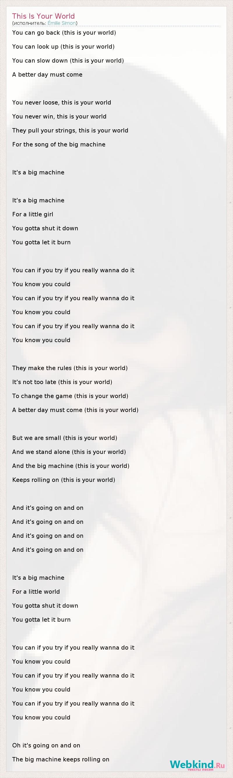 You can go back (this is your world) You can look up (this is your world) You can slow down (this is your world) A better day must come You never loose, this is your world You never win, this is your world They pull your strings, this is your world For the song of the big machine It's a big machine It's a big machine For a little girl You gotta shut it down You gotta let it burn You can if you try if you really wanna do it You know you could You can if you try if you really wanna do it You know you could You can if you try if you really wanna do it You know you could They make the rules (this is your world) It's not too late (this is your world) To change the game (this is your world) A better day must come (this is your world) But we are small (this is your world) And we stand alone (this is your world) And the big machine (this is your world) Keeps rolling on (this is your world) And it's going on and on And it's going on and on And it's going on and on And it's going on and on It's a big machine For a little world You gotta shut it down You gotta let it burn You can if you try if you really wanna do it You know you could You can if you try if you really wanna do it You know you could You can if you try if you really wanna do it You know you could Oh it's going on and on The big machine keeps rolling on