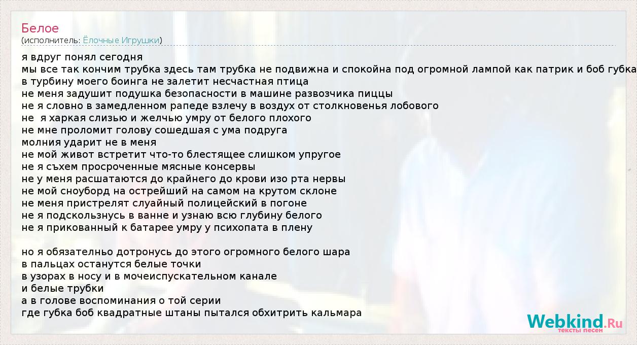я вдруг понял сегодня мы все так кончим трубка здесь там трубка не подвижна и спокойна под огромной лампой как патрик и боб губка в турбину моего боинга не залетит несчастная птица не меня задушит подушка безопасности в машине развозчика пиццы не я словно в замедленном рапеде взлечу в воздух от столкновенья лобового не я харкая слизью и желчью умру от белого плохого не мне проломит голову сошедшая с ума подруга молния ударит не в меня не мой живот встретит что-то блестящее слишком упругое не я съхем просроченные мясные консервы не у меня расшатаются до крайнего до крови изо рта нервы не мой сноуборд на острейший на самом на крутом склоне не меня пристрелят слуайный полицейский в погоне не я подскользнусь в ванне и узнаю всю глубину белого не я прикованный к батарее умру у психопата в плену но я обязателньо дотронусь до этого огромного белого шара в пальцах останутся белые точки в узорах в носу и в мочеиспускательном канале и белые трубки а в голове воспоминания о той серии где губка боб квадратные штаны пытался обхитрить кальмара