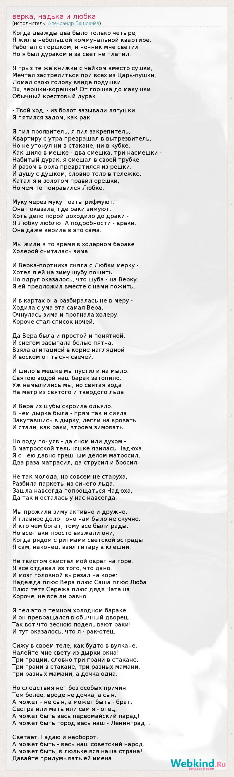 Когда дважды два было только четыре, Я жил в небольшой коммунальной квартире. Работал с горшком, и ночник мне светил Но я был дураком и за свет не платил. Я грыз те же книжки с чайком вместо сушки, Мечтал застрелиться при всех из Царь-пушки, Ломал свою голову ввиде подушки. Эх, вершки-корешки! От горшка до макушки Обычный крестовый дурак. - Твой ход, - из болот зазывали лягушки. Я пятился задом, как рак. Я пил проявитель, я пил закрепитель, Квартиру с утра превращал в вытрезвитель, Но не утонул ни в стакане, ни в кубке. Как шило в мешке - два смешка, три насмешки - Набитый дурак, я смешал в своей трубке И разом в орла превратился из решки. И душу с душком, словно тело в тележке, Катал я и золотом правил орешки, Но чем-то понравился Любке. Муку через муку поэты рифмуют. Она показала, где раки зимуют. Хоть дело порой доходило до драки - Я Любку люблю! А подробности - враки. Она даже верила в это сама. Мы жили в то время в холерном бараке Холерой считалась зима. И Верка-портниха сняла с Любки мерку - Хотел я ей на зиму шубу пошить. Но вдруг оказалось, что шуба - на Верку. Я ей предложил вместе с нами пожить. И в картах она разбиралась не в меру - Ходила с ума эта самая Вера. Очнулась зима и прогнала холеру. Короче стал список ночей. Да Вера была и простой и понятной, И снегом засыпала белые пятна, Взяла агитацией в корне наглядной И воском от тысяч свечей. И шило в мешке мы пустили на мыло. Святою водой наш барак затопило. Уж намылились мы, но святая вода На метр из святого и твердого льда. И Вера из шубы скроила одьяло. В нем дырка была - прям так и сияла. Закутавшись в дырку, легли на кровать И стали, как раки, втроем зимовать. Но воду почуяв - да сном или духом - В матросской тельняшке явилась Надюха. Я с нею давно грешным делом матросил, Два раза матрасил, да струсил и бросил. Не так молода, но совсем не старуха, Разбила паркеты из синего льда. Зашла навсегда попрощаться Надюха, Да так и осталась у нас навсегда. Мы прожили зиму активно и дружно. И главное дело - оно нам было не скучно. И кто чем богат, тому все были рады. Но все-таки просто визжали они, Когда рядом с ритмами светской эстрады Я сам, наконец, взял гитару в клешни. Не твистом свистел мой овраг на горе. Я все отдавал из того, что дано. И мозг головной вырезал на коре: Надежда плюс Вера плюс Саша плюс Люба Плюс тетя Сережа плюс дядя Наташа... Короче, не все ли равно. Я пел это в темном холодном бараке И он превращался в обычный дворец. Так вот что весною поделывают раки! И тут оказалось, что я - рак-отец. Сижу в своем теле, как будто в вулкане. Налейте мне свету из дырки окна! Три грации, словно три грани в стакане. Три грани в стакане, три разных мамани, три разных мамани, а дочка одна. Но следствия нет без особых причин. Тем более, вроде не дочка, а сын. А может - не сын, а может быть - брат, Сестра или мать или сам я - отец, А может быть весь первомайский парад! А может быть город весь наш - Ленинград!.. Светает. Гадаю и наоборот. А может быть - весь наш советский народ. А может быть, в люльке вся наша страна! Давайте придумывать ей имена.