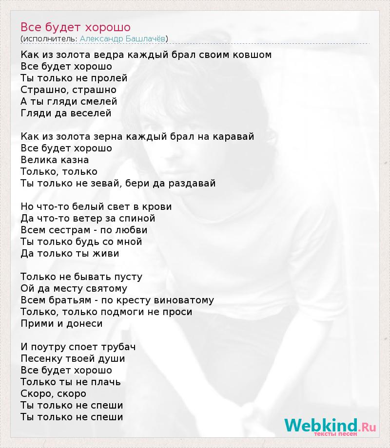 Как из золота ведра каждый брал своим ковшом Все будет хорошо Ты только не пролей Страшно, страшно А ты гляди смелей Гляди да веселей Как из золота зерна каждый брал на каравай Все будет хорошо Велика казна Только, только Ты только не зевай, бери да раздавай Но что-то белый свет в крови Да что-то ветер за спиной Всем сестрам - по любви Ты только будь со мной Да только ты живи Только не бывать пусту Ой да месту святому Всем братьям - по кресту виноватому Только, только подмоги не проси Прими и донеси И поутру споет трубач Песенку твоей души Все будет хорошо Только ты не плачь Скоро, скоро Ты только не спеши Ты только не спеши