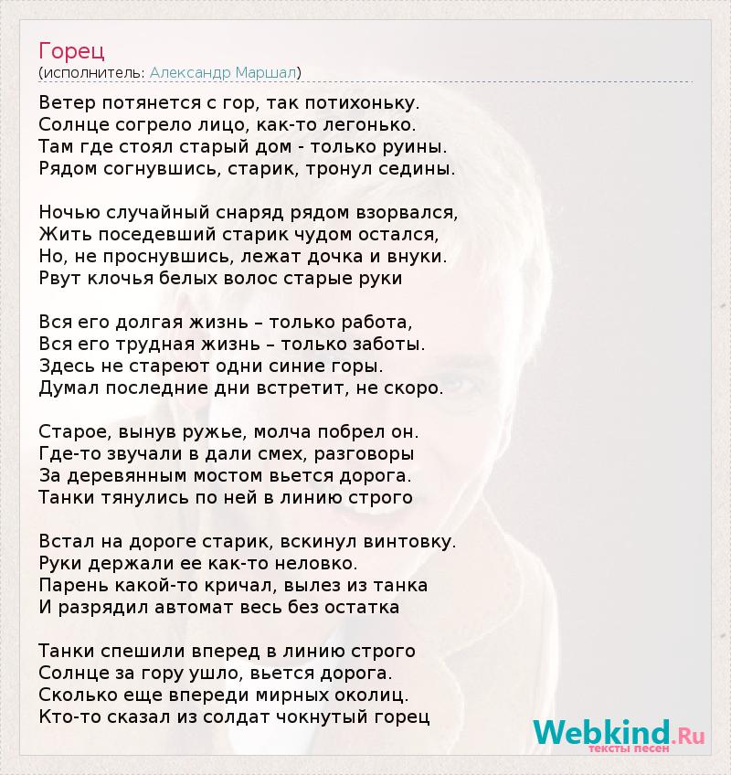 Ветер потянется с гор, так потихоньку. Солнце согрело лицо, как-то легонько. Там где стоял старый дом - только руины. Рядом согнувшись, старик, тронул седины. Ночью случайный снаряд рядом взорвался, Жить поседевший старик чудом остался, Но, не проснувшись, лежат дочка и внуки. Рвут клочья белых волос старые руки Вся его долгая жизнь – только работа, Вся его трудная жизнь – только заботы. Здесь не стареют одни синие горы. Думал последние дни встретит, не скоро. Старое, вынув ружье, молча побрел он. Где-то звучали в дали смех, разговоры За деревянным мостом вьется дорога. Танки тянулись по ней в линию строго Встал на дороге старик, вскинул винтовку. Руки держали ее как-то неловко. Парень какой-то кричал, вылез из танка И разрядил автомат весь без остатка Танки спешили вперед в линию строго Солнце за гору ушло, вьется дорога. Сколько еще впереди мирных околиц. Кто-то сказал из солдат чокнутый горец