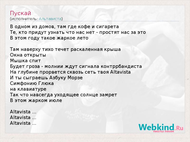 В одном из домов, там где кофе и сигарета Те, кто придут узнать что нас нет - простят нас за это В этом году такое жаркое лето Там наверху тихо течет раскаленная крыша Окна открыты Мышка спит Будет гроза - молнии ждут сигнала контррбандиста На глубине прорвется сквозь сеть твоя Altavista И ты сыграешь Азбуку Морзе Симфонию Глюка на клавиатуре Так что навсегда уходящее солнце замрет В этом жарком июле Altavista ... Altavista ... Altavista ...