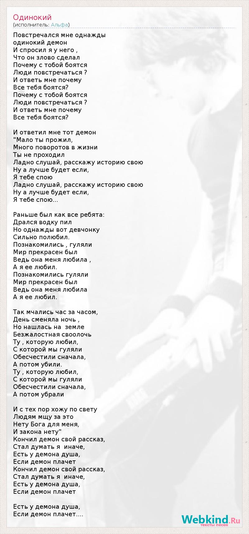 Повстречался мне однажды одинокий демон И спросил я у него , Что он злово сделал Почему с тобой боятся Люди повстречаться ? И ответь мне почему Все тебя боятся? Почему с тобой боятся Люди повстречаться ? И ответь мне почему Все тебя боятся? И ответил мне тот демон "Мало ты прожил, Много поворотов в жизни Ты не проходил Ладно слушай, расскажу историю свою Ну а лучше будет если, Я тебе спою Ладно слушай, расскажу историю свою Ну а лучше будет если, Я тебе спою... Раньше был как все ребята: Дрался водку пил Но однажды вот девчонку Сильно полюбил. Познакомились , гуляли Мир прекрасен был Ведь она меня любила , А я ее любил. Познакомились гуляли Мир прекрасен был Ведь она меня любила А я ее любил. Так мчались час за часом, День сменяла ночь , Но нашлась на земле Безжалостная своолочь Ту , которую любил, С которой мы гуляли Обесчестили сначала, А потом убили. Ту , которую любил, С которой мы гуляли Обесчестили сначала, А потом убрали И с тех пор хожу по свету Людям мщу за это Нету Бога для меня, И закона нету" Кончил демон свой рассказ, Стал думать я иначе, Есть у демона душа, Если демон плачет Кончил демон свой рассказ, Стал думать я иначе, Есть у демона душа, Если демон плачет Есть у демона душа, Если демон плачет....