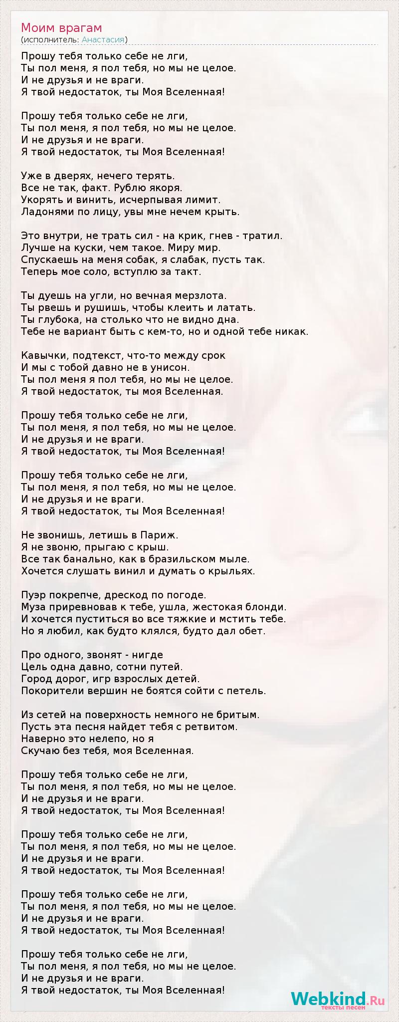Прошу тебя только себе не лги, Ты пол меня, я пол тебя, но мы не целое. И не друзья и не враги. Я твой недостаток, ты Моя Вселенная! Прошу тебя только себе не лги, Ты пол меня, я пол тебя, но мы не целое. И не друзья и не враги. Я твой недостаток, ты Моя Вселенная! Уже в дверях, нечего терять. Все не так, факт. Рублю якоря. Укорять и винить, исчерпывая лимит. Ладонями по лицу, увы мне нечем крыть. Это внутри, не трать сил - на крик, гнев - тратил. Лучше на куски, чем такое. Миру мир. Спускаешь на меня собак, я слабак, пусть так. Теперь мое соло, вступлю за такт. Ты дуешь на угли, но вечная мерзлота. Ты рвешь и рушишь, чтобы клеить и латать. Ты глубока, на столько что не видно дна. Тебе не вариант быть с кем-то, но и одной тебе никак. Кавычки, подтекст, что-то между срок И мы с тобой давно не в унисон. Ты пол меня я пол тебя, но мы не целое. Я твой недостаток, ты моя Вселенная. Прошу тебя только себе не лги, Ты пол меня, я пол тебя, но мы не целое. И не друзья и не враги. Я твой недостаток, ты Моя Вселенная! Прошу тебя только себе не лги, Ты пол меня, я пол тебя, но мы не целое. И не друзья и не враги. Я твой недостаток, ты Моя Вселенная! Не звонишь, летишь в Париж. Я не звоню, прыгаю с крыш. Все так банально, как в бразильском мыле. Хочется слушать винил и думать о крыльях. Пуэр покрепче, дрескод по погоде. Муза приревновав к тебе, ушла, жестокая блонди. И хочется пуститься во все тяжкие и мстить тебе. Но я любил, как будто клялся, будто дал обет. Про одного, звонят - нигде Цель одна давно, сотни путей. Город дорог, игр взрослых детей. Покорители вершин не боятся сойти с петель. Из сетей на поверхность немного не бритым. Пусть эта песня найдет тебя с ретвитом. Наверно это нелепо, но я Скучаю без тебя, моя Вселенная. Прошу тебя только себе не лги, Ты пол меня, я пол тебя, но мы не целое. И не друзья и не враги. Я твой недостаток, ты Моя Вселенная! Прошу тебя только себе не лги, Ты пол меня, я пол тебя, но мы не целое. И не друзья и не враги. Я твой недостаток, ты Моя Вселенная! Прошу тебя только себе не лги, Ты пол меня, я пол тебя, но мы не целое. И не друзья и не враги. Я твой недостаток, ты Моя Вселенная! Прошу тебя только себе не лги, Ты пол меня, я пол тебя, но мы не целое. И не друзья и не враги. Я твой недостаток, ты Моя Вселенная!