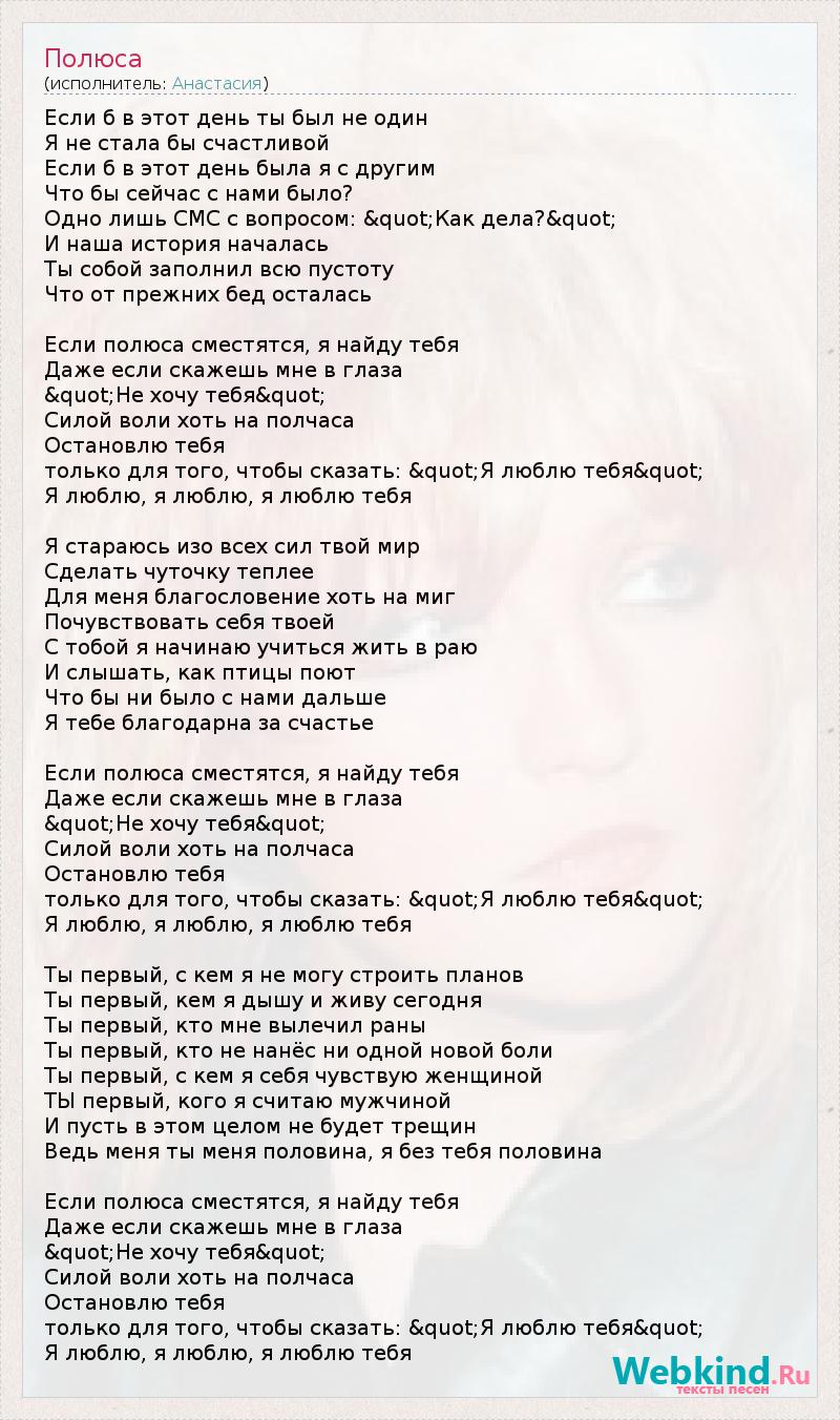 Если б в этот день ты был не один Я не стала бы счастливой Если б в этот день была я с другим Что бы сейчас с нами было? Одно лишь СМС с вопросом: "Как дела?" И наша история началась Ты собой заполнил всю пустоту Что от прежних бед осталась Если полюса сместятся, я найду тебя Даже если скажешь мне в глаза "Не хочу тебя" Силой воли хоть на полчаса Остановлю тебя только для того, чтобы сказать: "Я люблю тебя" Я люблю, я люблю, я люблю тебя Я стараюсь изо всех сил твой мир Сделать чуточку теплее Для меня благословение хоть на миг Почувствовать себя твоей С тобой я начинаю учиться жить в раю И слышать, как птицы поют Что бы ни было с нами дальше Я тебе благодарна за счастье Если полюса сместятся, я найду тебя Даже если скажешь мне в глаза "Не хочу тебя" Силой воли хоть на полчаса Остановлю тебя только для того, чтобы сказать: "Я люблю тебя" Я люблю, я люблю, я люблю тебя Ты первый, с кем я не могу строить планов Ты первый, кем я дышу и живу сегодня Ты первый, кто мне вылечил раны Ты первый, кто не нанёс ни одной новой боли Ты первый, с кем я себя чувствую женщиной ТЫ первый, кого я считаю мужчиной И пусть в этом целом не будет трещин Ведь меня ты меня половина, я без тебя половина Если полюса сместятся, я найду тебя Даже если скажешь мне в глаза "Не хочу тебя" Силой воли хоть на полчаса Остановлю тебя только для того, чтобы сказать: "Я люблю тебя" Я люблю, я люблю, я люблю тебя
