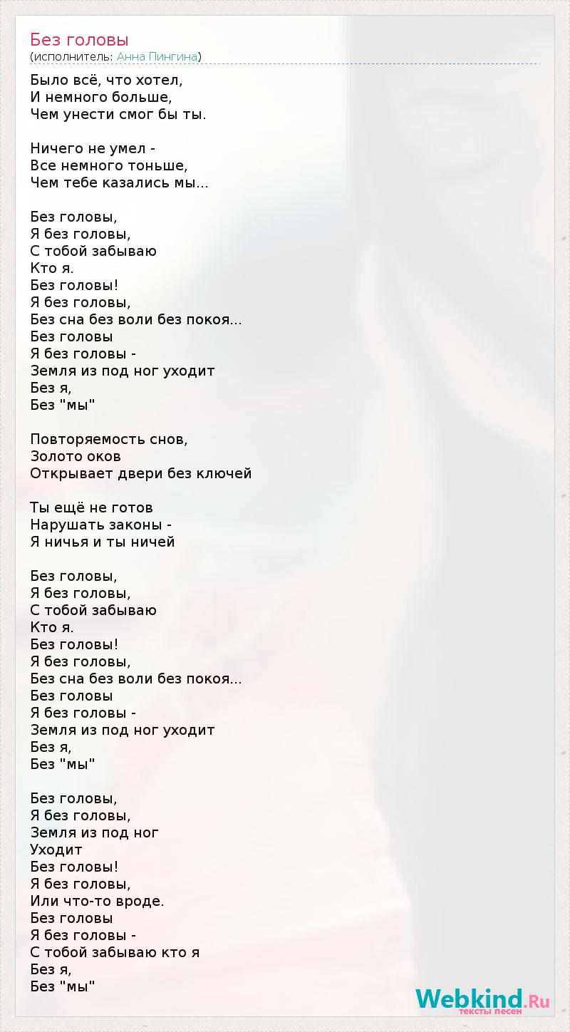 Было всё, что хотел, И немного больше, Чем унести смог бы ты. Ничего не умел - Все немного тоньше, Чем тебе казались мы... Без головы, Я без головы, С тобой забываю Кто я. Без головы! Я без головы, Без сна без воли без покоя... Без головы Я без головы - Земля из под ног уходит Без я, Без "мы" Повторяемость снов, Золото оков Открывает двери без ключей Ты ещё не готов Нарушать законы - Я ничья и ты ничей Без головы, Я без головы, С тобой забываю Кто я. Без головы! Я без головы, Без сна без воли без покоя... Без головы Я без головы - Земля из под ног уходит Без я, Без "мы" Без головы, Я без головы, Земля из под ног Уходит Без головы! Я без головы, Или что-то вроде. Без головы Я без головы - С тобой забываю кто я Без я, Без "мы"