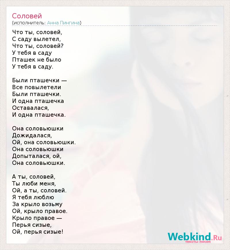 Что ты, соловей, С саду вылетел, Что ты, соловей? У тебя в саду Пташек не было У тебя в саду. Были пташечки — Все повылетели Были пташечки. И одна пташечка Оставалася, И одна пташечка. Она соловьюшки Дожидалася, Ой, она соловьюшки. Она соловьюшки Допыталася, ой, Она соловьюшки. А ты, соловей, Ты люби меня, Ой, а ты, соловей. Я тебя люблю За крыло возьму Ой, крыло правое. Крыло правое — Перья сизые, Ой, перья сизые!