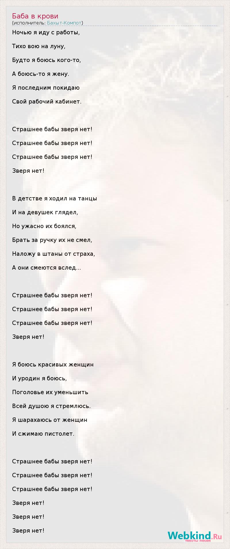 Ночью я иду с работы, Тихо вою на луну, Будто я боюсь кого-то, А боюсь-то я жену. Я последним покидаю Свой рабочий кабинет. Страшнее бабы зверя нет! Страшнее бабы зверя нет! Страшнее бабы зверя нет! Зверя нет! В детстве я ходил на танцы И на девушек глядел, Но ужасно их боялся, Брать за ручку их не смел, Наложу в штаны от страха, А они смеются вслед... Страшнее бабы зверя нет! Страшнее бабы зверя нет! Страшнее бабы зверя нет! Зверя нет! Я боюсь красивых женщин И уродин я боюсь, Поголовье их уменьшить Всей душою я стремлюсь. Я шарахаюсь от женщин И сжимаю пистолет. Страшнее бабы зверя нет! Страшнее бабы зверя нет! Страшнее бабы зверя нет! Зверя нет! Зверя нет! Зверя нет!