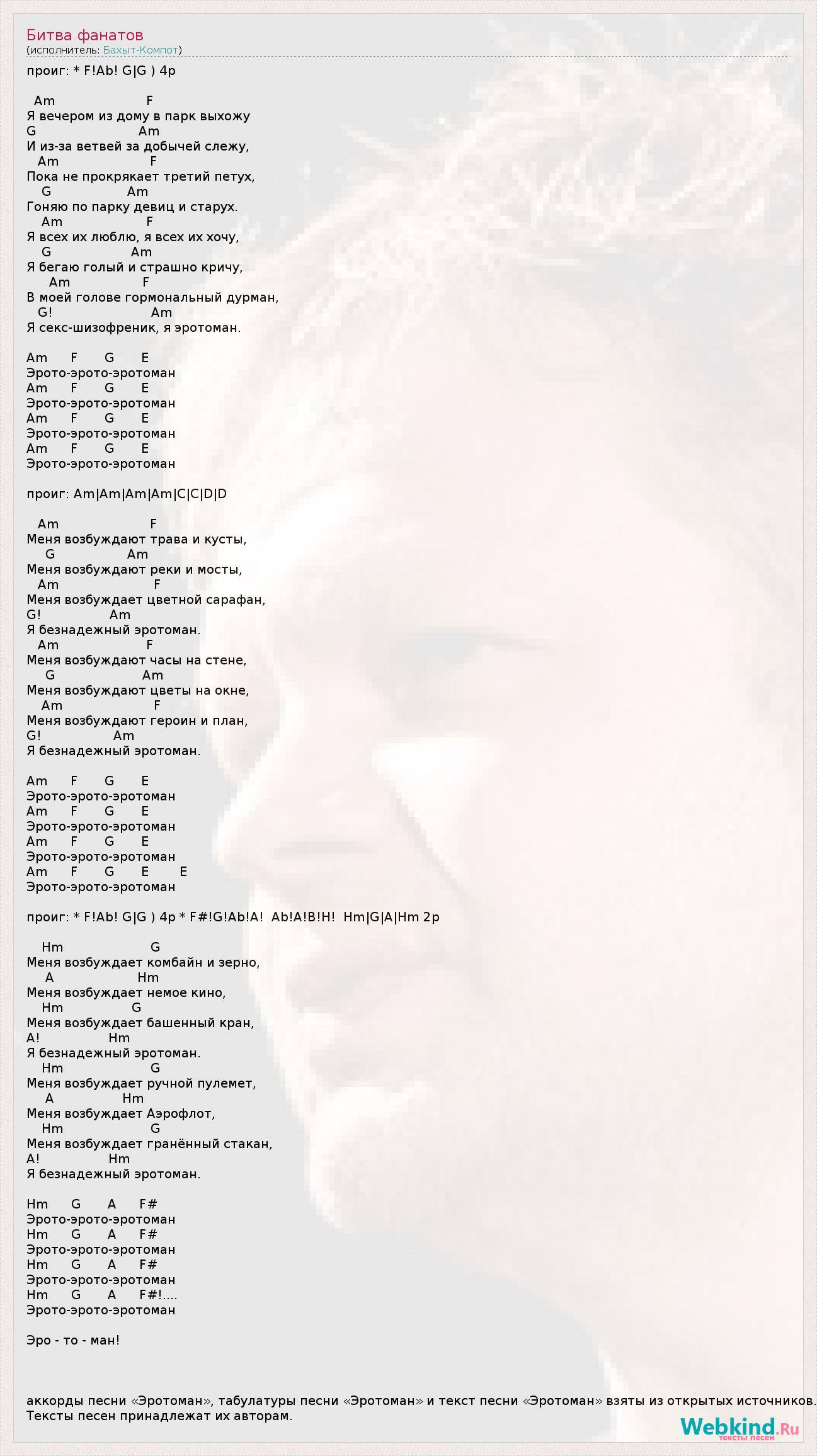 аккорды песни «Эротоман», табулатуры песни «Эротоман» и текст песни «Эротоман» взяты из открытых источников.