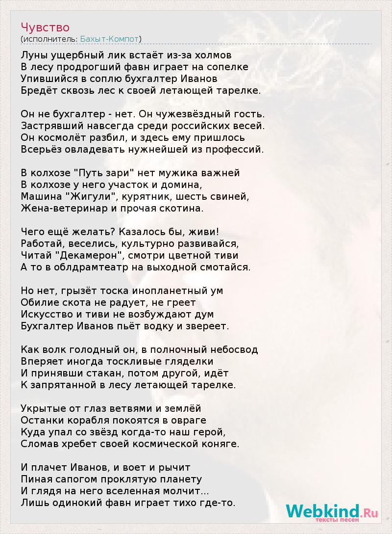 Луны ущербный лик встаёт из-за холмов В лесу продрогший фавн играет на сопелке Упившийся в соплю бухгалтер Иванов Бредёт сквозь лес к своей летающей тарелке. Он не бухгалтер - нет. Он чужезвёздный гость. Застрявший навсегда среди российских весей. Он космолёт разбил, и здесь ему пришлось Всерьёз овладевать нужнейшей из профессий. В колхозе "Путь зари" нет мужика важней В колхозе у него участок и домина, Машина "Жигули", курятник, шесть свиней, Жена-ветеринар и прочая скотина. Чего ещё желать? Казалось бы, живи! Работай, веселись, культурно развивайся, Читай "Декамерон", смотри цветной тиви А то в облдрамтеатр на выходной смотайся. Но нет, грызёт тоска инопланетный ум Обилие скота не радует, не греет Искусство и тиви не возбуждают дум Бухгалтер Иванов пьёт водку и звереет. Как волк голодный он, в полночный небосвод Вперяет иногда тоскливые гляделки И принявши стакан, потом другой, идёт К запрятанной в лесу летающей тарелке. Укрытые от глаз ветвями и землёй Останки корабля покоятся в овраге Куда упал со звёзд когда-то наш герой, Сломав хребет своей космической коняге. И плачет Иванов, и воет и рычит Пиная сапогом проклятую планету И глядя на него вселенная молчит... Лишь одинокий фавн играет тихо где-то.