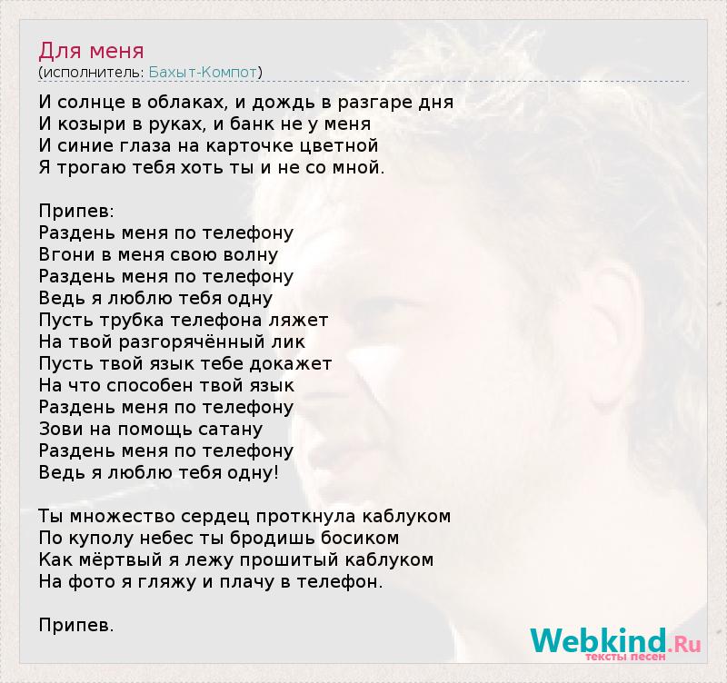 И солнце в облаках, и дождь в разгаре дня И козыри в руках, и банк не у меня И синие глаза на карточке цветной Я трогаю тебя хоть ты и не со мной. Припев: Раздень меня по телефону Вгони в меня свою волну Раздень меня по телефону Ведь я люблю тебя одну Пусть трубка телефона ляжет На твой разгорячённый лик Пусть твой язык тебе докажет На что способен твой язык Раздень меня по телефону Зови на помощь сатану Раздень меня по телефону Ведь я люблю тебя одну! Ты множество сердец проткнула каблуком По куполу небес ты бродишь босиком Как мёртвый я лежу прошитый каблуком На фото я гляжу и плачу в телефон. Припев.