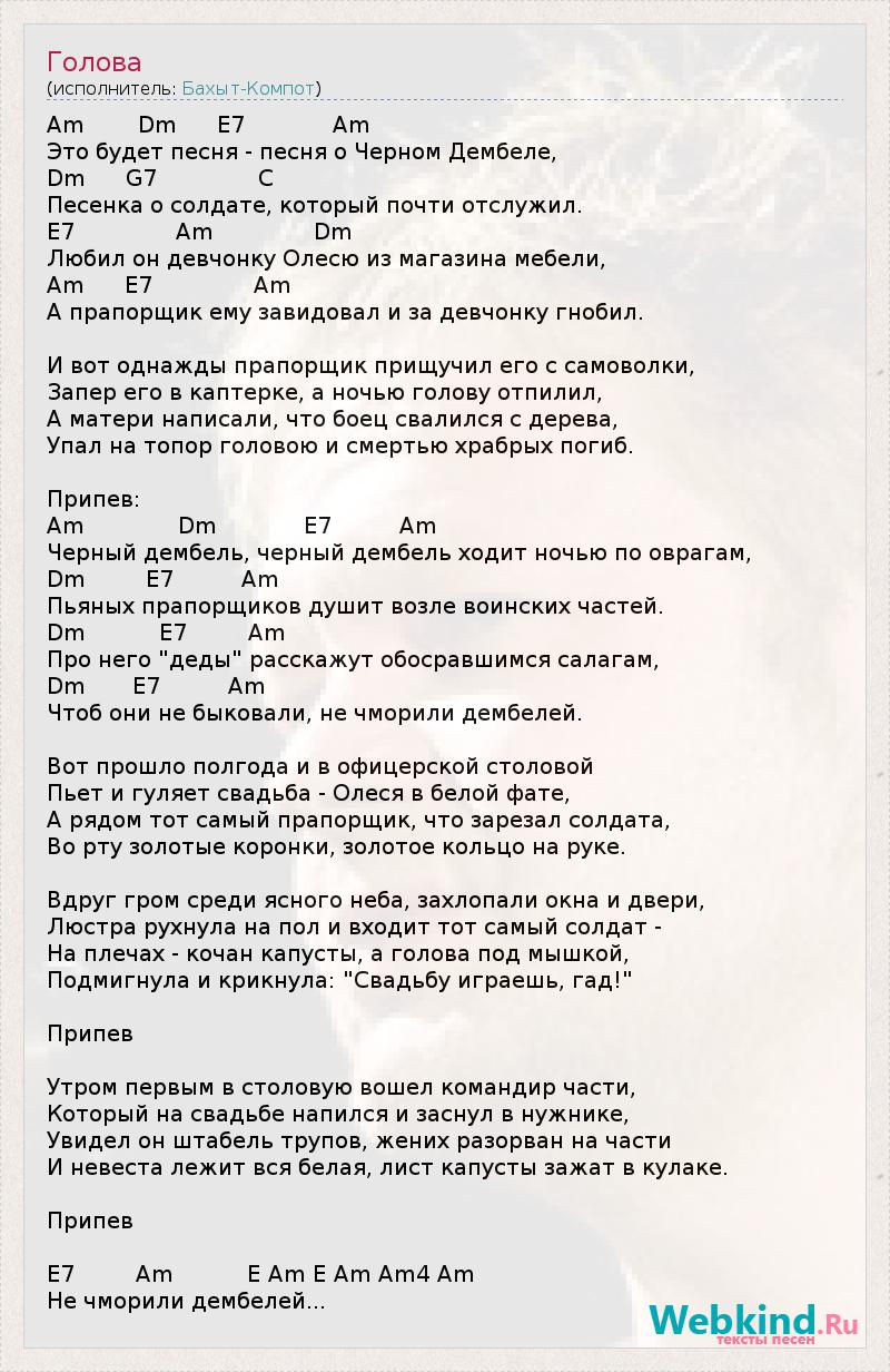 Am Dm E7 Am Это будет песня - песня о Черном Дембеле, Dm G7 C Песенка о солдате, который почти отслужил. E7 Am Dm Любил он девчонку Олесю из магазина мебели, Am E7 Am А прапорщик ему завидовал и за девчонку гнобил. И вот однажды прапорщик прищучил его с самоволки, Запер его в каптерке, а ночью голову отпилил, А матери написали, что боец свалился с дерева, Упал на топор головою и смертью храбрых погиб. Припев: Am Dm E7 Am Черный дембель, черный дембель ходит ночью по оврагам, Dm E7 Am Пьяных прапорщиков душит возле воинских частей. Dm E7 Am Про него "деды" расскажут обосравшимся салагам, Dm E7 Am Чтоб они не быковали, не чморили дембелей. Вот прошло полгода и в офицерской столовой Пьет и гуляет свадьба - Олеся в белой фате, А рядом тот самый прапорщик, что зарезал солдата, Во рту золотые коронки, золотое кольцо на руке. Вдруг гром среди ясного неба, захлопали окна и двери, Люстра рухнула на пол и входит тот самый солдат - На плечах - кочан капусты, а голова под мышкой, Подмигнула и крикнула: "Свадьбу играешь, гад!" Припев Утром первым в столовую вошел командир части, Который на свадьбе напился и заснул в нужнике, Увидел он штабель трупов, жених разорван на части И невеста лежит вся белая, лист капусты зажат в кулаке. Припев E7 Am E Am E Am Am4 Am Не чморили дембелей...