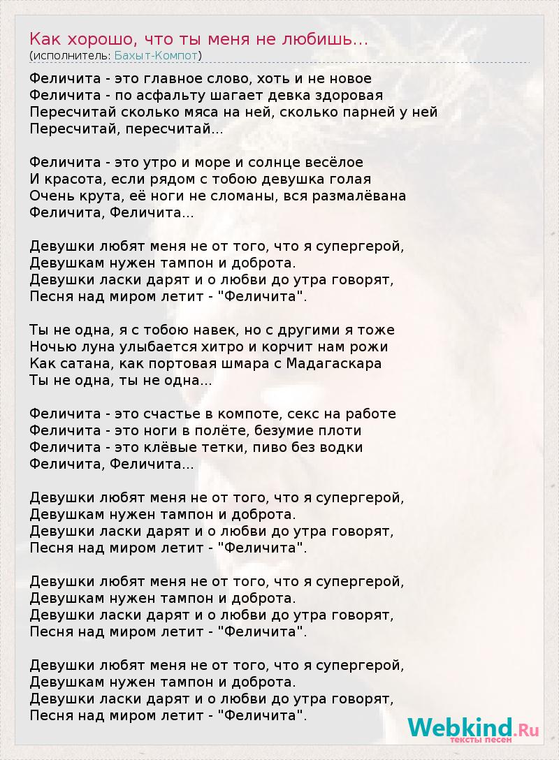 Феличита - это главное слово, хоть и не новое Феличита - по асфальту шагает девка здоровая Пересчитай сколько мяса на ней, сколько парней у ней Пересчитай, пересчитай... Феличита - это утро и море и солнце весёлое И красота, если рядом с тобою девушка голая Очень крута, её ноги не сломаны, вся размалёвана Феличита, Феличита... Девушки любят меня не от того, что я супергерой, Девушкам нужен тампон и доброта. Девушки ласки дарят и о любви до утра говорят, Песня над миром летит - "Феличита". Ты не одна, я с тобою навек, но с другими я тоже Ночью луна улыбается хитро и корчит нам рожи Как сатана, как портовая шмара с Мадагаскара Ты не одна, ты не одна... Феличита - это счастье в компоте, секс на работе Феличита - это ноги в полёте, безумие плоти Феличита - это клёвые тетки, пиво без водки Феличита, Феличита... Девушки любят меня не от того, что я супергерой, Девушкам нужен тампон и доброта. Девушки ласки дарят и о любви до утра говорят, Песня над миром летит - "Феличита". Девушки любят меня не от того, что я супергерой, Девушкам нужен тампон и доброта. Девушки ласки дарят и о любви до утра говорят, Песня над миром летит - "Феличита". Девушки любят меня не от того, что я супергерой, Девушкам нужен тампон и доброта. Девушки ласки дарят и о любви до утра говорят, Песня над миром летит - "Феличита".
