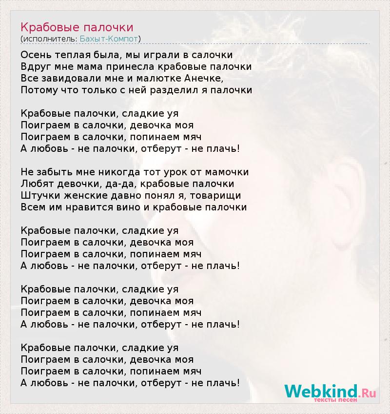 ГлавнаяИсполнителиБахыт-КомпотКрабовые палочки