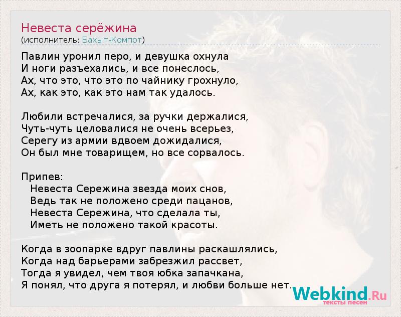 Павлин уронил перо, и девушка охнула И ноги разъехались, и все понеслось, Ах, что это, что это по чайнику грохнуло, Ах, как это, как это нам так удалось. Любили встречалися, за ручки держалися, Чуть-чуть целовалися не очень всерьез, Серегу из армии вдвоем дожидалися, Он был мне товарищем, но все сорвалось. Припев: Невеста Сережина звезда моих снов, Ведь так не положено среди пацанов, Невеста Сережина, что сделала ты, Иметь не положено такой красоты. Когда в зоопарке вдруг павлины раскашлялись, Когда над барьерами забрезжил рассвет, Тогда я увидел, чем твоя юбка запачкана, Я понял, что друга я потерял, и любви больше нет.
