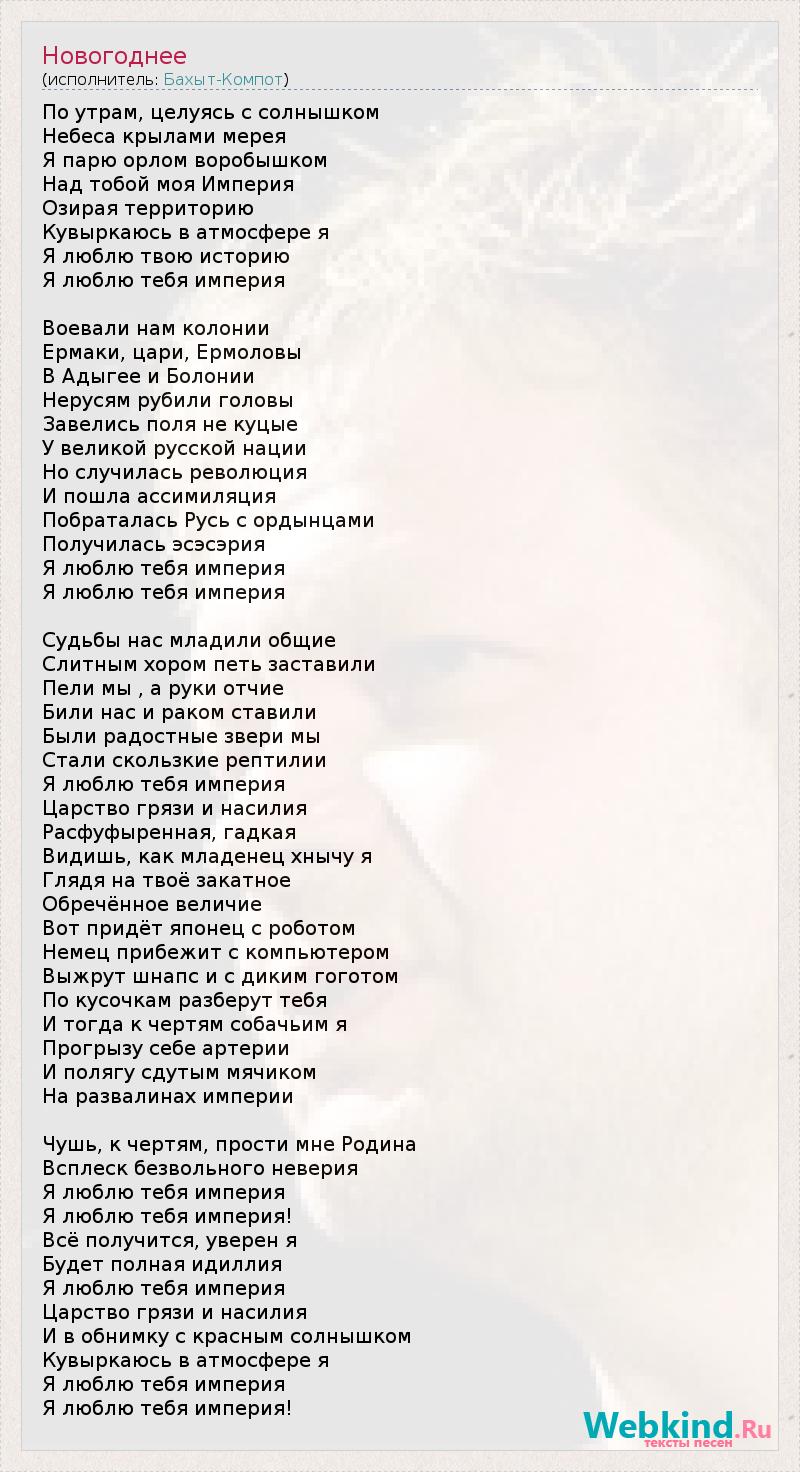 По утрам, целуясь с солнышком Небеса крылами мерея Я парю орлом воробышком Над тобой моя Империя Озирая территорию Кувыркаюсь в атмосфере я Я люблю твою историю Я люблю тебя империя Воевали нам колонии Ермаки, цари, Ермоловы В Адыгее и Болонии Нерусям рубили головы Завелись поля не куцые У великой русской нации Но случилась революция И пошла ассимиляция Побраталась Русь с ордынцами Получилась эсэсэрия Я люблю тебя империя Я люблю тебя империя Судьбы нас младили общие Слитным хором петь заставили Пели мы , а руки отчие Били нас и раком ставили Были радостные звери мы Стали скользкие рептилии Я люблю тебя империя Царство грязи и насилия Расфуфыренная, гадкая Видишь, как младенец хнычу я Глядя на твоё закатное Обречённое величие Вот придёт японец с роботом Немец прибежит с компьютером Выжрут шнапс и с диким гоготом По кусочкам разберут тебя И тогда к чертям собачьим я Прогрызу себе артерии И полягу сдутым мячиком На развалинах империи Чушь, к чертям, прости мне Родина Всплеск безвольного неверия Я люблю тебя империя Я люблю тебя империя! Всё получится, уверен я Будет полная идиллия Я люблю тебя империя Царство грязи и насилия И в обнимку с красным солнышком Кувыркаюсь в атмосфере я Я люблю тебя империя Я люблю тебя империя!