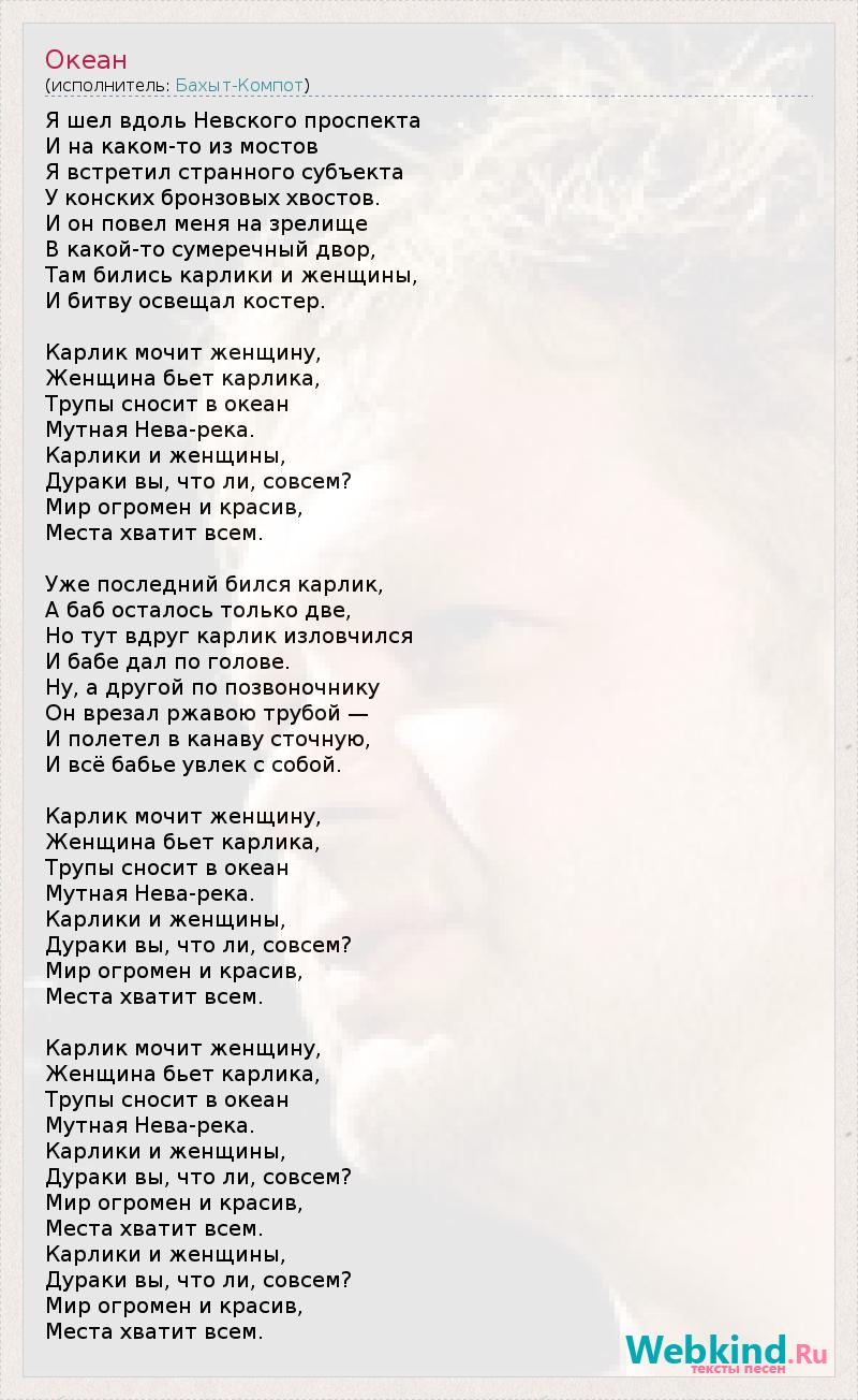 Я шел вдоль Невского проспекта И на каком-то из мостов Я встретил странного субъекта У конских бронзовых хвостов. И он повел меня на зрелище В какой-то сумеречный двор, Там бились карлики и женщины, И битву освещал костер. Карлик мочит женщину, Женщина бьет карлика, Трупы сносит в океан Мутная Нева-река. Карлики и женщины, Дураки вы, что ли, совсем? Мир огромен и красив, Места хватит всем. Уже последний бился карлик, А баб осталось только две, Но тут вдруг карлик изловчился И бабе дал по голове. Ну, а другой по позвоночнику Он врезал ржавою трубой — И полетел в канаву сточную, И всё бабье увлек с собой. Карлик мочит женщину, Женщина бьет карлика, Трупы сносит в океан Мутная Нева-река. Карлики и женщины, Дураки вы, что ли, совсем? Мир огромен и красив, Места хватит всем. Карлик мочит женщину, Женщина бьет карлика, Трупы сносит в океан Мутная Нева-река. Карлики и женщины, Дураки вы, что ли, совсем? Мир огромен и красив, Места хватит всем. Карлики и женщины, Дураки вы, что ли, совсем? Мир огромен и красив, Места хватит всем.