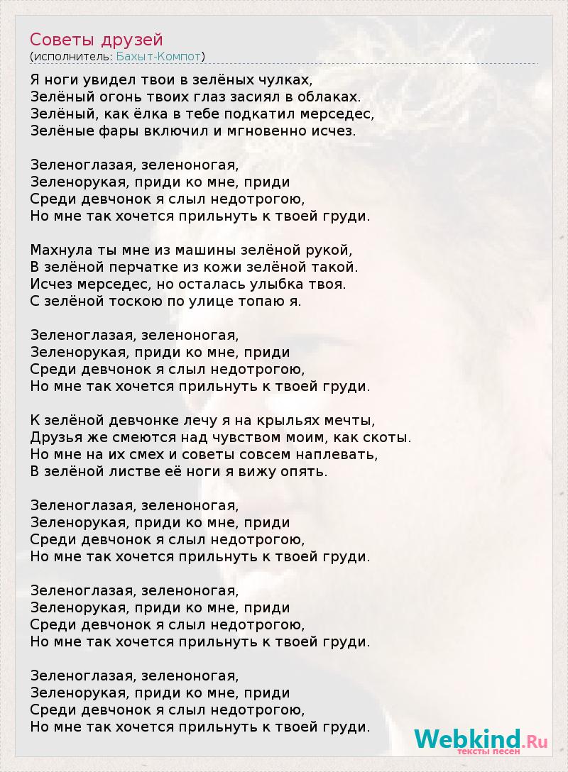 Я ноги увидел твои в зелёных чулках, Зелёный огонь твоих глаз засиял в облаках. Зелёный, как ёлка в тебе подкатил мерседес, Зелёные фары включил и мгновенно исчез. Зеленоглазая, зеленоногая, Зеленорукая, приди ко мне, приди Среди девчонок я слыл недотрогою, Но мне так хочется прильнуть к твоей груди. Махнула ты мне из машины зелёной рукой, В зелёной перчатке из кожи зелёной такой. Исчез мерседес, но осталась улыбка твоя. С зелёной тоскою по улице топаю я. Зеленоглазая, зеленоногая, Зеленорукая, приди ко мне, приди Среди девчонок я слыл недотрогою, Но мне так хочется прильнуть к твоей груди. К зелёной девчонке лечу я на крыльях мечты, Друзья же смеются над чувством моим, как скоты. Но мне на их смех и советы совсем наплевать, В зелёной листве её ноги я вижу опять. Зеленоглазая, зеленоногая, Зеленорукая, приди ко мне, приди Среди девчонок я слыл недотрогою, Но мне так хочется прильнуть к твоей груди. Зеленоглазая, зеленоногая, Зеленорукая, приди ко мне, приди Среди девчонок я слыл недотрогою, Но мне так хочется прильнуть к твоей груди. Зеленоглазая, зеленоногая, Зеленорукая, приди ко мне, приди Среди девчонок я слыл недотрогою, Но мне так хочется прильнуть к твоей груди.