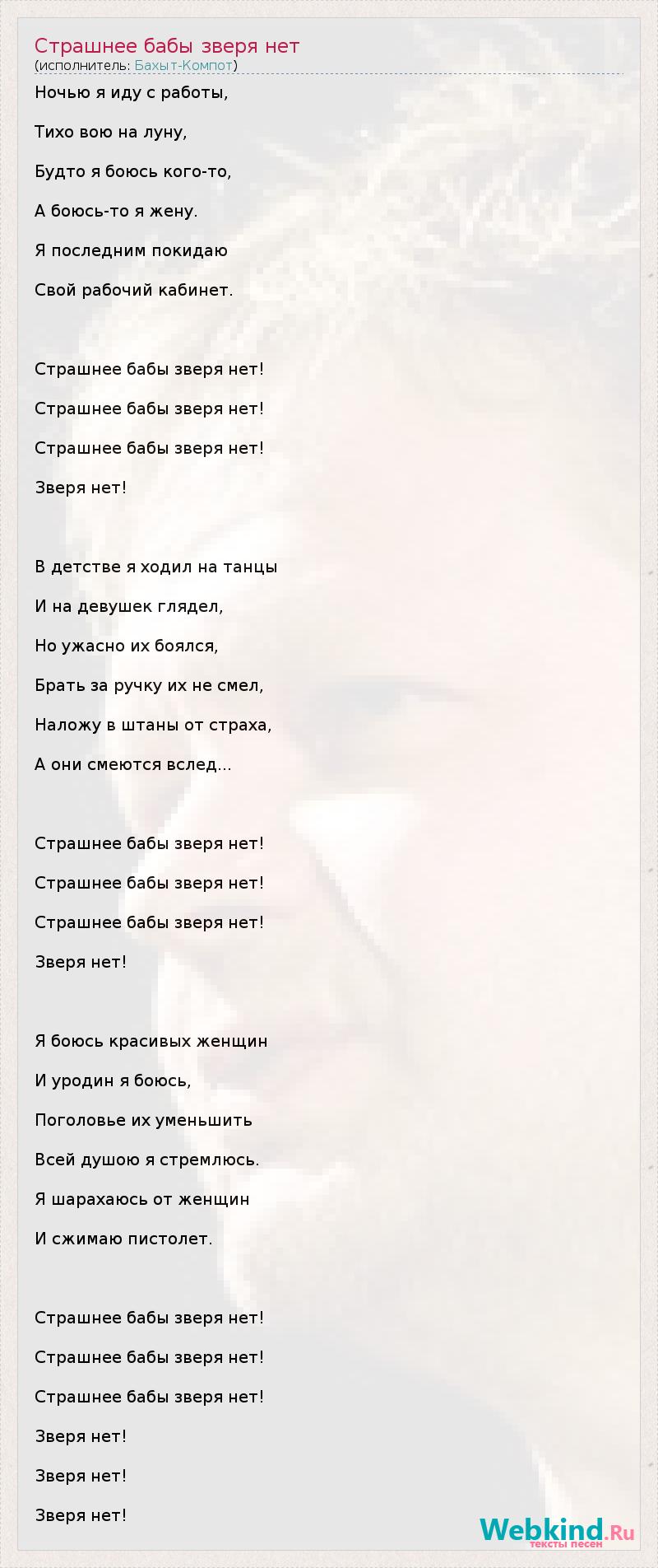 Ночью я иду с работы, Тихо вою на луну, Будто я боюсь кого-то, А боюсь-то я жену. Я последним покидаю Свой рабочий кабинет. Страшнее бабы зверя нет! Страшнее бабы зверя нет! Страшнее бабы зверя нет! Зверя нет! В детстве я ходил на танцы И на девушек глядел, Но ужасно их боялся, Брать за ручку их не смел, Наложу в штаны от страха, А они смеются вслед... Страшнее бабы зверя нет! Страшнее бабы зверя нет! Страшнее бабы зверя нет! Зверя нет! Я боюсь красивых женщин И уродин я боюсь, Поголовье их уменьшить Всей душою я стремлюсь. Я шарахаюсь от женщин И сжимаю пистолет. Страшнее бабы зверя нет! Страшнее бабы зверя нет! Страшнее бабы зверя нет! Зверя нет! Зверя нет! Зверя нет!