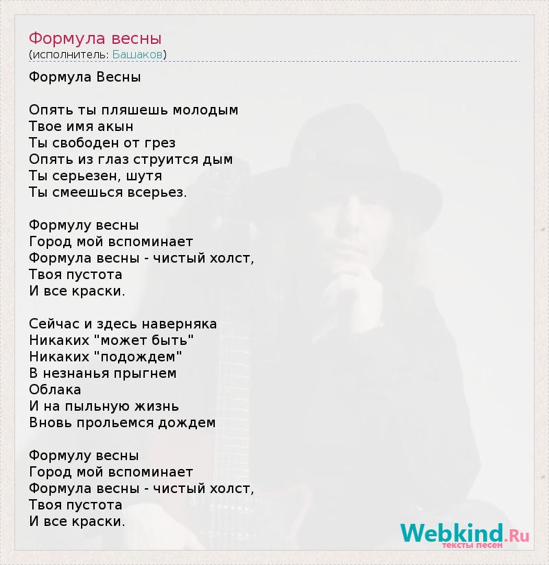 Формула Весны Опять ты пляшешь молодым Твое имя акын Ты свободен от грез Опять из глаз струится дым Ты серьезен, шутя Ты смеешься всерьез. Формулу весны Город мой вспоминает Формула весны - чистый холст, Твоя пустота И все краски. Сейчас и здесь наверняка Никаких "может быть" Никаких "подождем" В незнанья прыгнем Облака И на пыльную жизнь Вновь прольемся дождем Формулу весны Город мой вспоминает Формула весны - чистый холст, Твоя пустота И все краски.