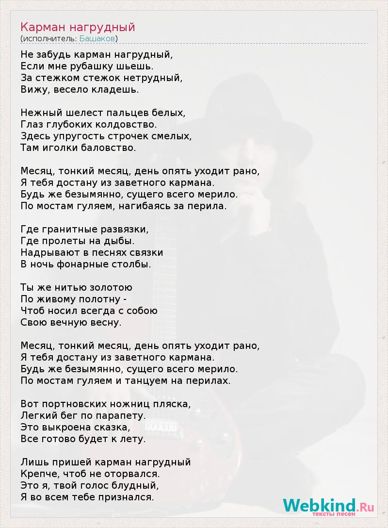 Не забудь карман нагрудный, Если мне рубашку шьешь. За стежком стежок нетрудный, Вижу, весело кладешь. Нежный шелест пальцев белых, Глаз глубоких колдовство. Здесь упругость строчек смелых, Там иголки баловство. Месяц, тонкий месяц, день опять уходит рано, Я тебя достану из заветного кармана. Будь же безымянно, сущего всего мерило. По мостам гуляем, нагибаясь за перила. Где гранитные развязки, Где пролеты на дыбы. Надрывают в песнях связки В ночь фонарные столбы. Ты же нитью золотою По живому полотну - Чтоб носил всегда с собою Свою вечную весну. Месяц, тонкий месяц, день опять уходит рано, Я тебя достану из заветного кармана. Будь же безымянно, сущего всего мерило. По мостам гуляем и танцуем на перилах. Вот портновских ножниц пляска, Легкий бег по парапету. Это выкроена сказка, Все готово будет к лету. Лишь пришей карман нагрудный Крепче, чтоб не оторвался. Это я, твой голос блудный, Я во всем тебе признался.