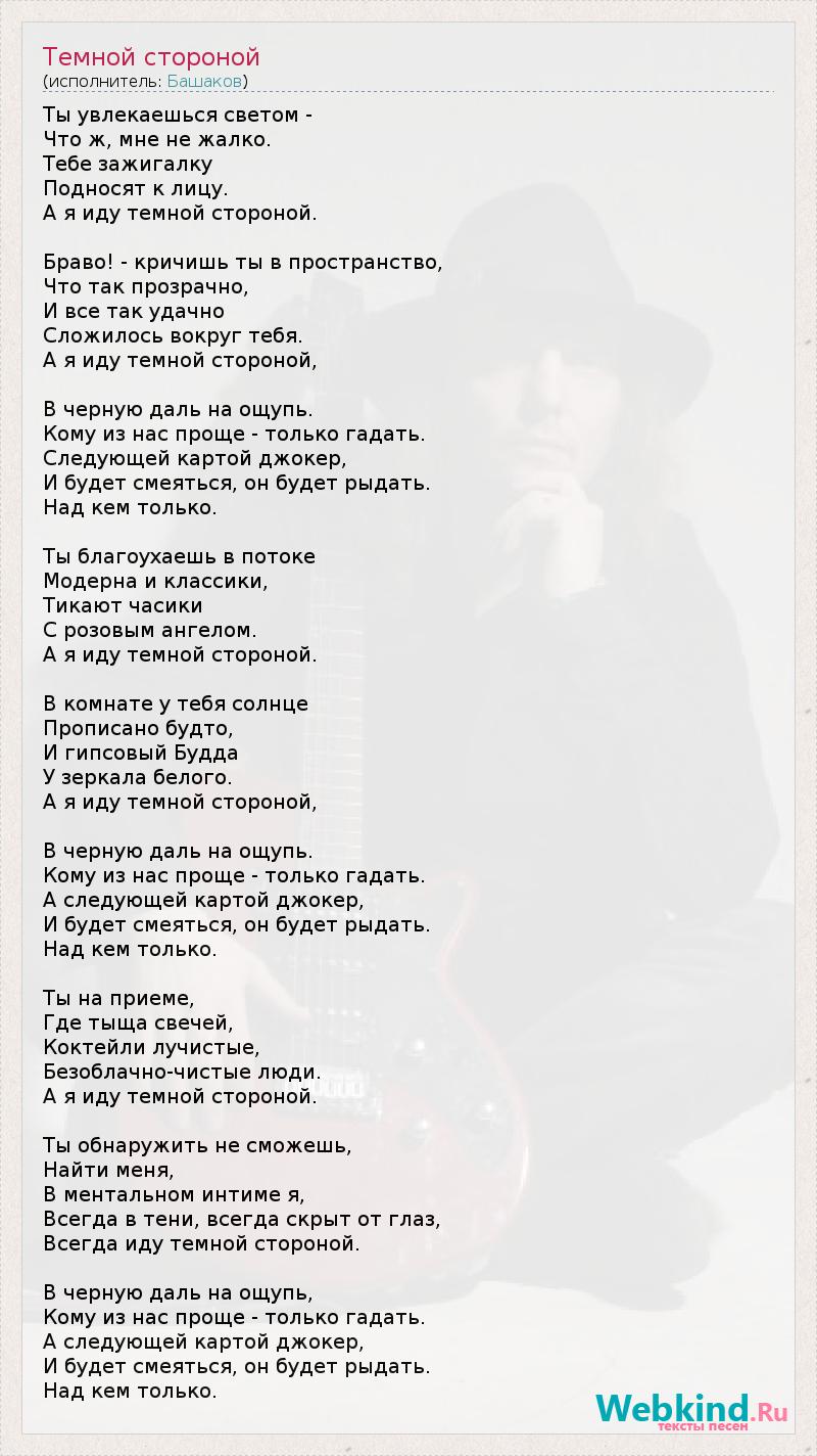 Ты увлекаешься светом - Что ж, мне не жалко. Тебе зажигалку Подносят к лицу. А я иду темной стороной. Браво! - кричишь ты в пространство, Что так прозрачно, И все так удачно Сложилось вокруг тебя. А я иду темной стороной, В черную даль на ощупь. Кому из нас проще - только гадать. Следующей картой джокер, И будет смеяться, он будет рыдать. Над кем только. Ты благоухаешь в потоке Модерна и классики, Тикают часики С розовым ангелом. А я иду темной стороной. В комнате у тебя солнце Прописано будто, И гипсовый Будда У зеркала белого. А я иду темной стороной, В черную даль на ощупь. Кому из нас проще - только гадать. А следующей картой джокер, И будет смеяться, он будет рыдать. Над кем только. Ты на приеме, Где тыща свечей, Коктейли лучистые, Безоблачно-чистые люди. А я иду темной стороной. Ты обнаружить не сможешь, Найти меня, В ментальном интиме я, Всегда в тени, всегда скрыт от глаз, Всегда иду темной стороной. В черную даль на ощупь, Кому из нас проще - только гадать. А следующей картой джокер, И будет смеяться, он будет рыдать. Над кем только.