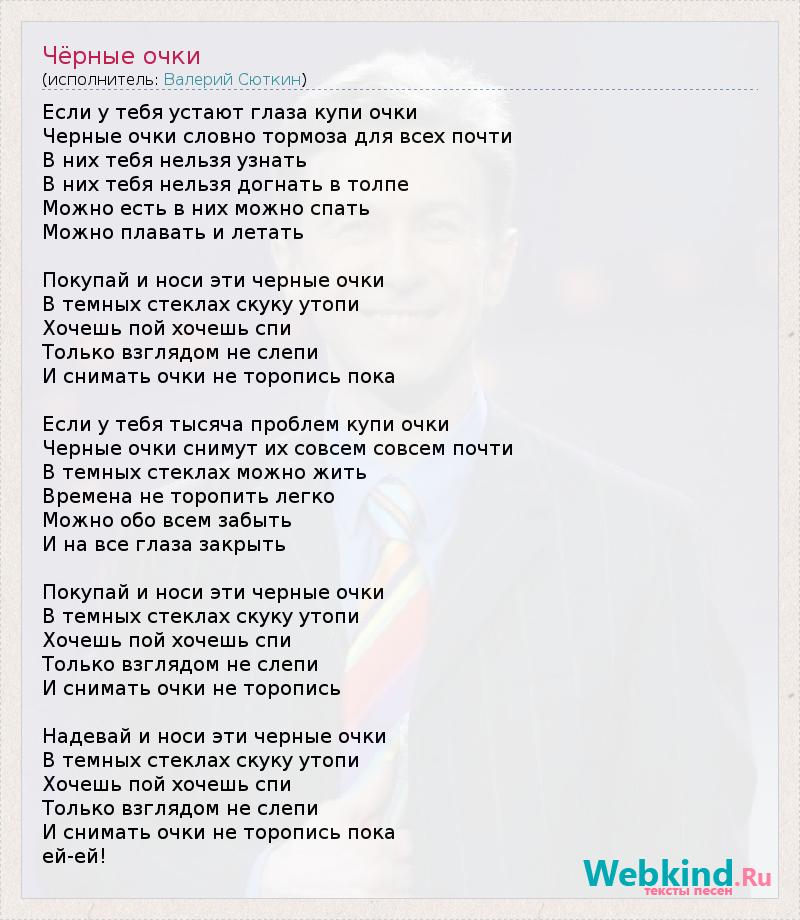 Если у тебя устают глаза купи очки Черные очки словно тормоза для всех почти В них тебя нельзя узнать В них тебя нельзя догнать в толпе Можно есть в них можно спать Можно плавать и летать Покупай и носи эти черные очки В темных стеклах скуку утопи Хочешь пой хочешь спи Только взглядом не слепи И снимать очки не торопись пока Если у тебя тысяча проблем купи очки Черные очки снимут их совсем совсем почти В темных стеклах можно жить Времена не торопить легко Можно обо всем забыть И на все глаза закрыть Покупай и носи эти черные очки В темных стеклах скуку утопи Хочешь пой хочешь спи Только взглядом не слепи И снимать очки не торопись Надевай и носи эти черные очки В темных стеклах скуку утопи Хочешь пой хочешь спи Только взглядом не слепи И снимать очки не торопись пока ей-ей!