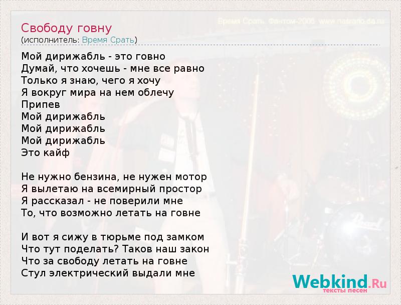 Мой дирижабль - это говно Думай, что хочешь - мне все равно Только я знаю, чего я хочу Я вокруг мира на нем облечу Припев Мой дирижабль Мой дирижабль Мой дирижабль Это кайф Не нужно бензина, не нужен мотор Я вылетаю на всемирный простор Я рассказал - не поверили мне То, что возможно летать на говне И вот я сижу в тюрьме под замком Что тут поделать? Таков наш закон Что за свободу летать на говне Стул электрический выдали мне