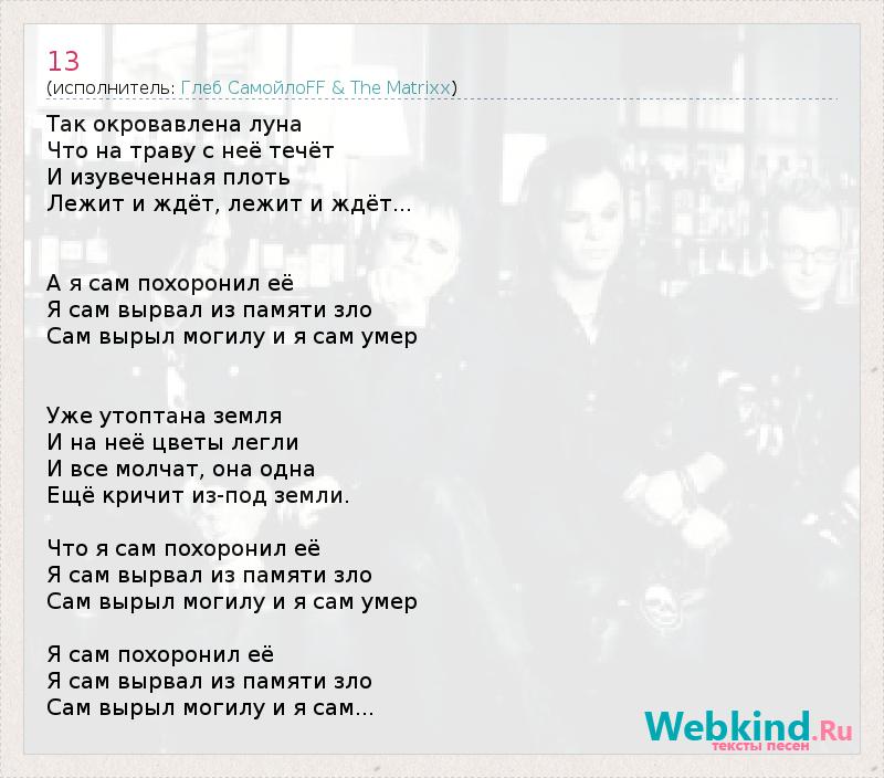 Так окровавлена луна Что на траву с неё течёт И изувеченная плоть Лежит и ждёт, лежит и ждёт... А я сам похоронил её Я сам вырвал из памяти зло Сам вырыл могилу и я сам умер Уже утоптана земля И на неё цветы легли И все молчат, она одна Ещё кричит из-под земли. Что я сам похоронил её Я сам вырвал из памяти зло Сам вырыл могилу и я сам умер Я сам похоронил её Я сам вырвал из памяти зло Сам вырыл могилу и я сам...
