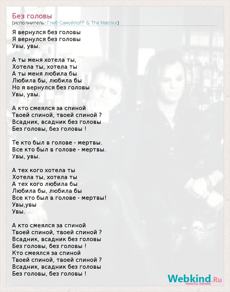Я вернулся без головы Я вернулся без головы Увы, увы. А ты меня хотела ты, Хотела ты, хотела ты А ты меня любила бы Любила бы, любила бы Но я вернулся без головы Увы, увы. А кто смеялся за спиной Твоей спиной, твоей спиной ? Всадник, всадник без головы Без головы, без головы ! Те кто был в голове - мертвы. Все кто был в голове - мертвы. Увы, увы. А тех кого хотела ты Хотела ты, хотела ты А тех кого любила бы Любила бы, любила бы Все кто был в голове - мертвы! Увы,увы Увы. А кто смеялся за спиной Твоей спиной, твоей спиной ? Всадник, всадник без головы Без головы, без головы ! Кто смеялся за спиной Твоей спиной, твоей спиной ? Всадник, всадник без головы Без головы, без головы !