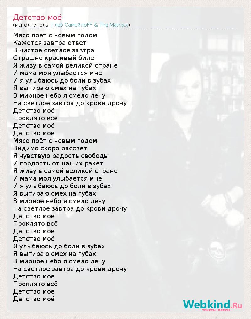 Мясо поёт с новым годом Кажется завтра ответ В чистое светлое завтра Страшно красивый билет Я живу в самой великой стране И мама моя улыбается мне И я улыбаюсь до боли в зубах Я вытираю смех на губах В мирное небо я смело лечу На светлое завтра до крови дрочу Детство моё Проклято всё Детство моё Детство моё Мясо поёт с новым годом Видимо скоро рассвет Я чувствую радость свободы И гордость от наших ракет Я живу в самой великой стране И мама моя улыбается мне И я улыбаюсь до боли в зубах Я вытираю смех на губах В мирное небо я смело лечу На светлое завтра до крови дрочу Детство моё Проклято всё Детство моё Детство моё Я улыбаюсь до боли в зубах Я вытираю смех на губах В мирное небо я смело лечу На светлое завтра до крови дрочу Детство моё Проклято всё Детство моё Детство моё