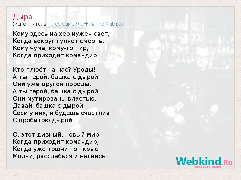 Кому здесь на хер нужен свет, Когда вокруг гуляет смерть. Кому чума, кому-то пир, Когда приходит командир. Кто плюёт на нас? Уроды! А ты герой, башка с дырой. Они уже другой породы, А ты герой, башка с дырой. Они мутированы властью, Давай, башка с дырой. Соси у них, и будешь счастлив С пробитою дырой. О, этот дивный, новый мир, Когда приходит командир, Когда уже тошнит от крыс, Молчи, расслабься и нагнись.