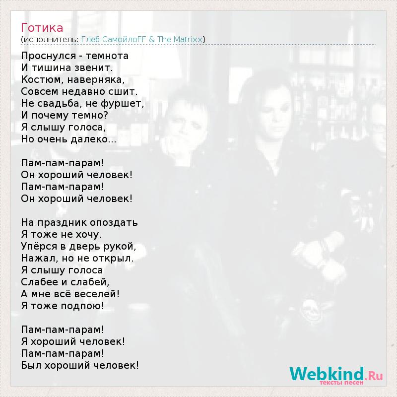 Проснулся - темнота И тишина звенит. Костюм, наверняка, Совсем недавно сшит. Не свадьба, не фуршет, И почему темно? Я слышу голоса, Но очень далеко... Пам-пам-парам! Он хороший человек! Пам-пам-парам! Он хороший человек! На праздник опоздать Я тоже не хочу. Упёрся в дверь рукой, Нажал, но не открыл. Я слышу голоса Слабее и слабей, А мне всё веселей! Я тоже подпою! Пам-пам-парам! Я хороший человек! Пам-пам-парам! Был хороший человек!