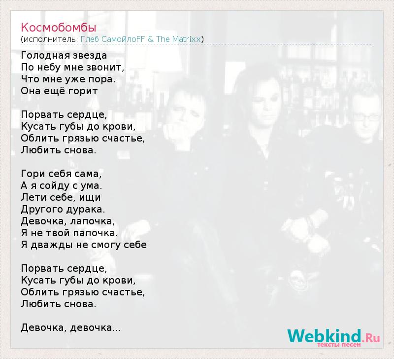 Голодная звезда По небу мне звонит, Что мне уже пора. Она ещё горит Порвать сердце, Кусать губы до крови, Облить грязью счастье, Любить снова. Гори себя сама, А я сойду с ума. Лети себе, ищи Другого дурака. Девочка, лапочка, Я не твой папочка. Я дважды не смогу себе Порвать сердце, Кусать губы до крови, Облить грязью счастье, Любить снова. Девочка, девочка...