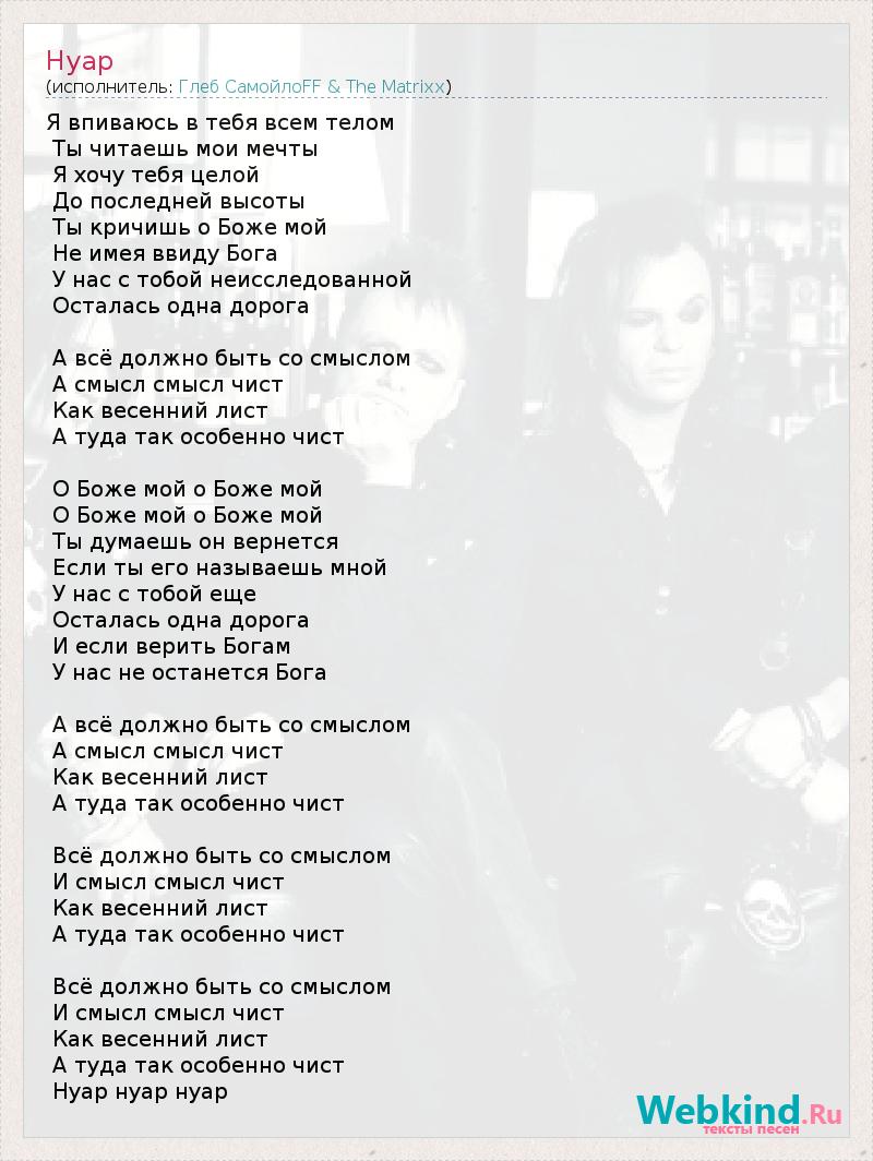 Я впиваюсь в тебя всем телом Ты читаешь мои мечты Я хочу тебя целой До последней высоты Ты кричишь о Боже мой Не имея ввиду Бога У нас с тобой неисследованной Осталась одна дорога А всё должно быть со смыслом А смысл смысл чист Как весенний лист А туда так особенно чист О Боже мой о Боже мой О Боже мой о Боже мой Ты думаешь он вернется Если ты его называешь мной У нас с тобой еще Осталась одна дорога И если верить Богам У нас не останется Бога А всё должно быть со смыслом А смысл смысл чист Как весенний лист А туда так особенно чист Всё должно быть со смыслом И смысл смысл чист Как весенний лист А туда так особенно чист Всё должно быть со смыслом И смысл смысл чист Как весенний лист А туда так особенно чист Нуар нуар нуар