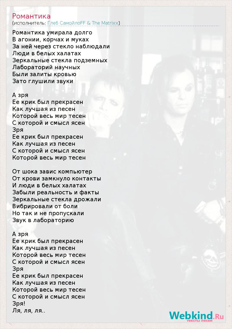 Романтика умирала долго В агонии, корчах и муках За ней через стекло наблюдали Люди в белых халатах Зеркальные стекла подземных Лабораторий научных Были залиты кровью Зато глушили звуки А зря Ее крик был прекрасен Как лучшая из песен Которой весь мир тесен С которой и смысл ясен Зря Ее крик был прекрасен Как лучшая из песен С которой и смысл ясен Которой весь мир тесен От шока завис компьютер От крови замкнуло контакты И люди в белых халатах Забыли реальность и факты Зеркальные стекла дрожали Вибрировали от боли Но так и не пропускали Звук в лабораторию А зря Ее крик был прекрасен Как лучшая из песен Которой весь мир тесен С которой и смысл ясен Зря Ее крик был прекрасен Как лучшая из песен Которой весь мир тесен С которой и смысл ясен Зря! Ля, ля, ля..